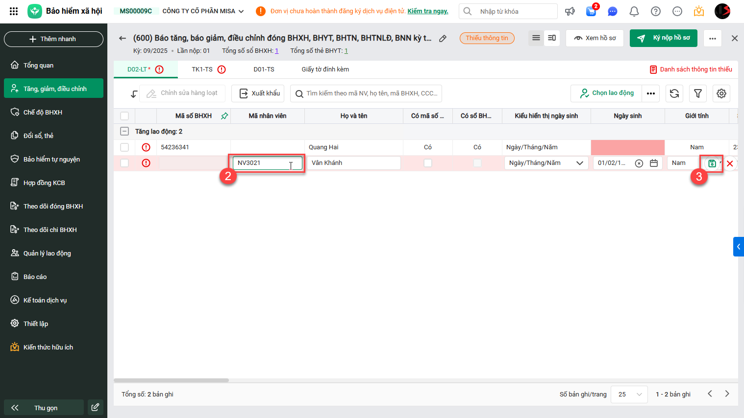 Bước 2: Chỉnh sửa sau đó nhấn Lưu ngay tại dòng lao động.