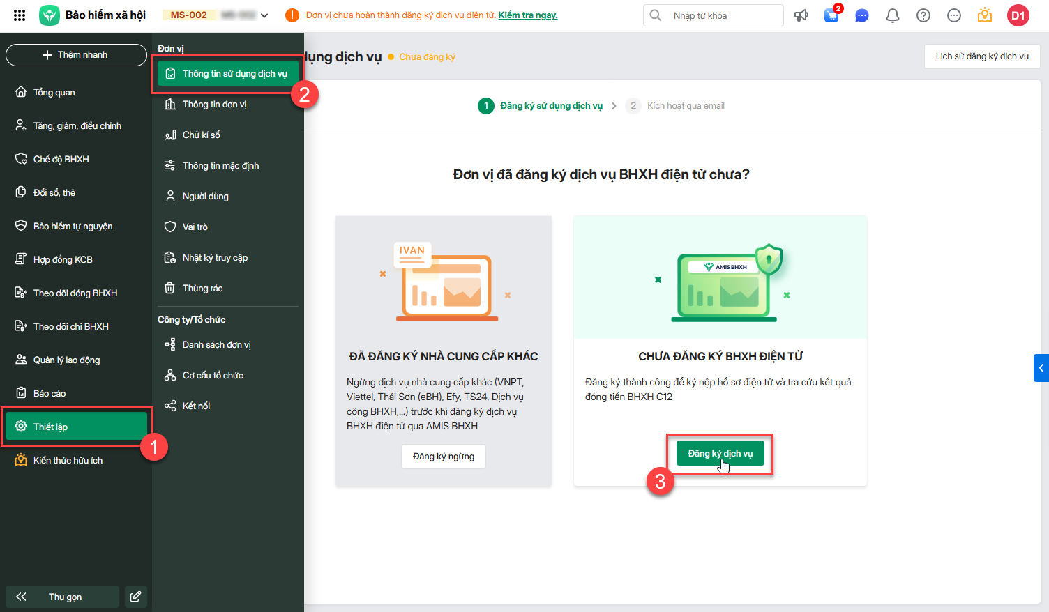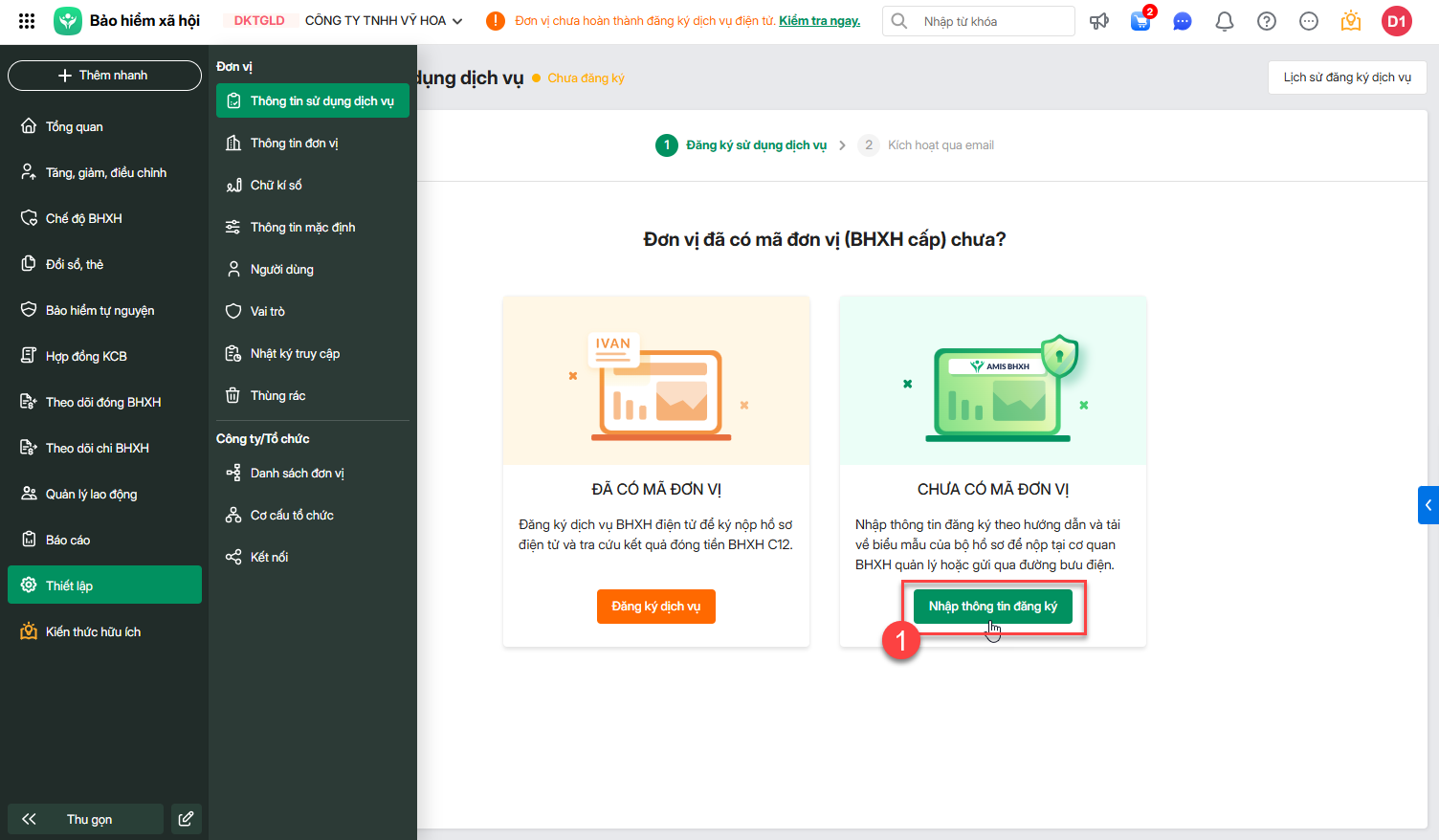 Sau khi được cấp mã đơn vị, Anh/Chị đăng nhập phần mềm AMIS BHXH, tại Thiết lập\Thông tin sử dụng dịch vụ để đăng ký sử dụng dịch vụ BHXH điện tử.