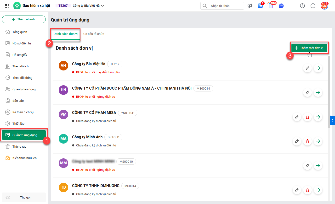 Tại Quản trị ứng dụng\Danh sách đơn vị\nhấn Thêm mới đơn vị.