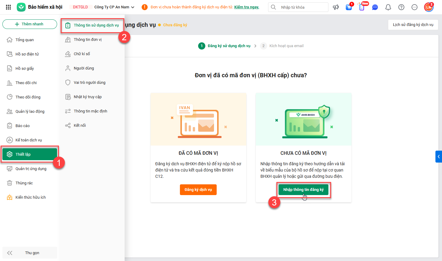 Sau khi được cấp mã đơn vị, Anh/Chị đăng nhập phần mềm AMIS BHXH, tại Thiết lập\Thông tin sử dụng dịch vụ để đăng ký sử dụng dịch vụ BHXH điện tử.