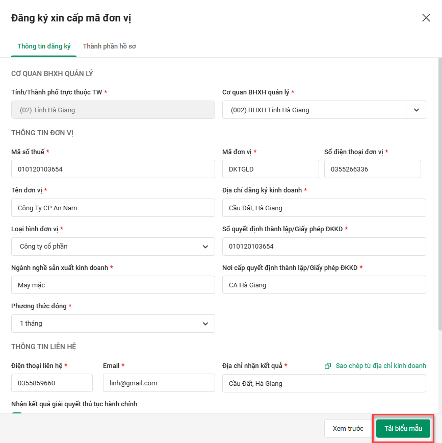 Nhấn Tải biểu mẫu, phần mềm sẽ tự động cập nhật các thông tin đăng ký về các biểu mẫu theo yêu cầu của cơ quan BHXH. Anh/Chị kiểm tra lại thông tin sau đó in ra giấy và nộp tại cơ quan BHXH quản lý hoặc nộp qua đường bưu điện.