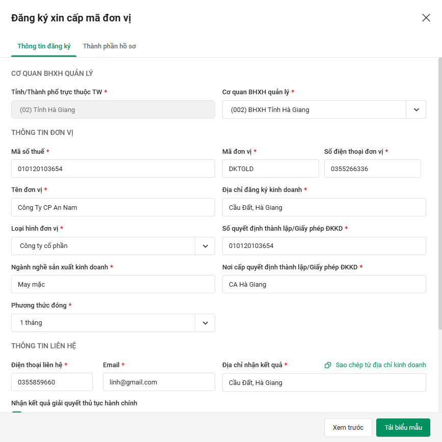 Điền đầy đủ thông tin đăng ký xin cấp mã đơn vị.