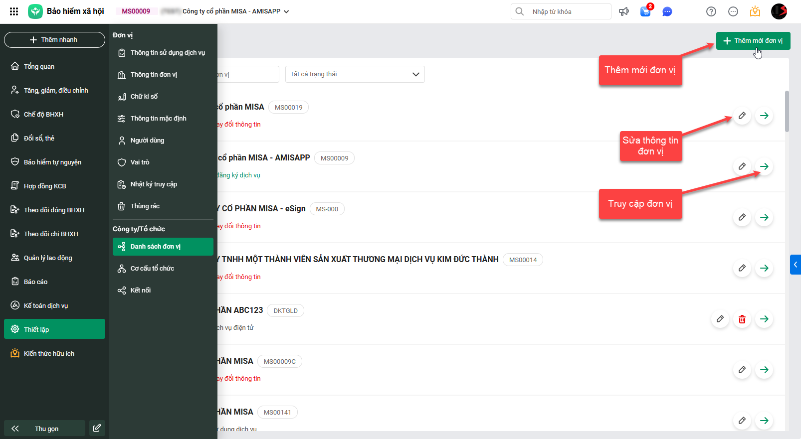 Tại Thiết lập\Danh sách đơn vị: hiển thị thông tin các công ty con/chi nhánh/bộ phận/phòng ban thuộc quản lý của đơn vị. Cho phép sửa thông tin đơn vị, thêm mới đơn vị và truy cập ngay vào đơn vị mong muốn.