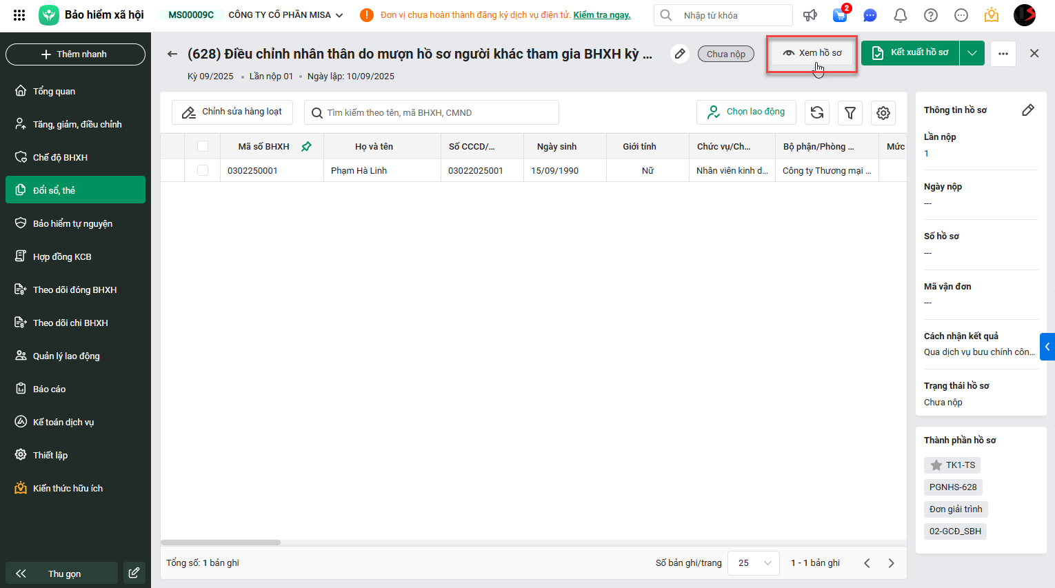Sau khi thêm lao động thành công vào thủ tục. Danh sách người lao động và các thông tin liên quan sẽ được hệ thống tự động đưa vào các biểu mẫu theo ban hành của cơ quan BHXH. Để xem trước, nhấn Xem hồ sơ.