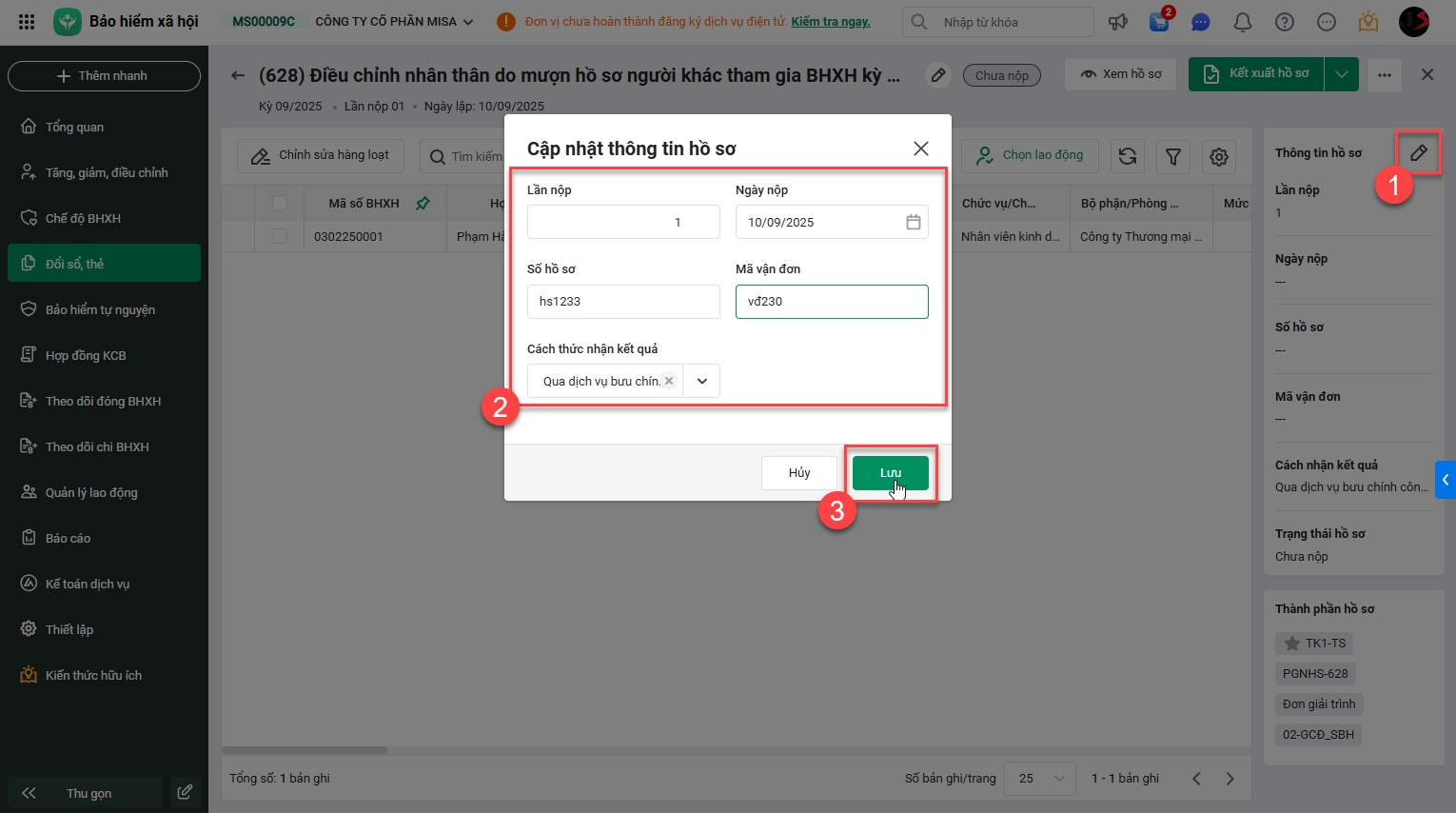 2. Sau khi nộp hồ sơ, cơ quan BHXH sẽ gửi về đơn vị thông tin hồ sơ đã nộp (số hồ sơ, mã vận đơn). Anh/Chị có thể chọn biểu tượng cái bút để cập nhật các thông tin hồ sơ sau đó nhấn Lưu, phần mềm sẽ tự động cập nhật trạng thái hồ sơ theo số hồ sơ đã nhập.