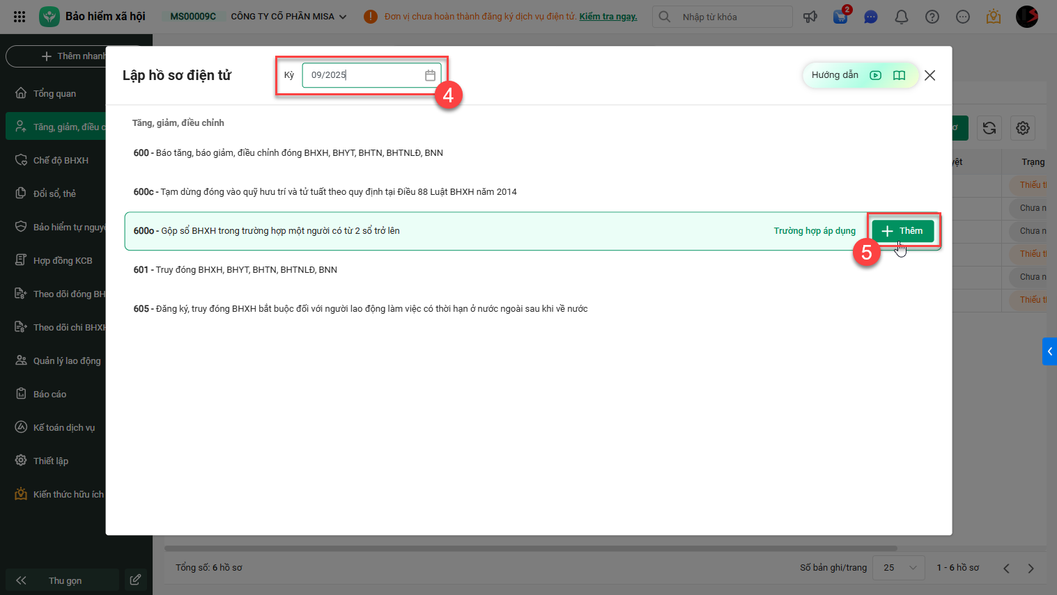 Chọn Kỳ kê khai và nhấn Thêm tại thủ tục 600o.