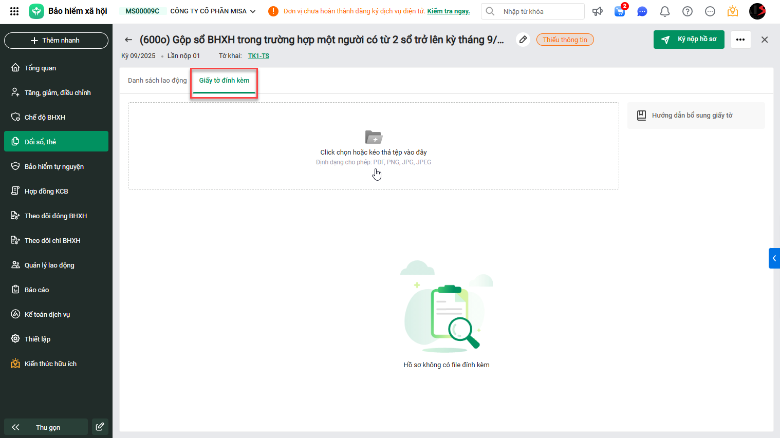 Đính kèm giấy tờ tại tab Giấy tờ đính kèm (đính kèm ảnh các sổ BHXH cần gộp).
