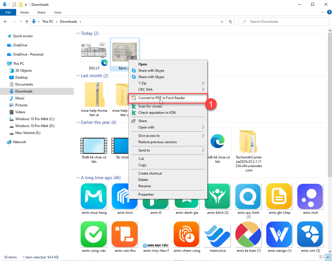 Bước 1: Nhấn chuột phải tại tệp\chọn Convert to PDF in Foxit Reader.
