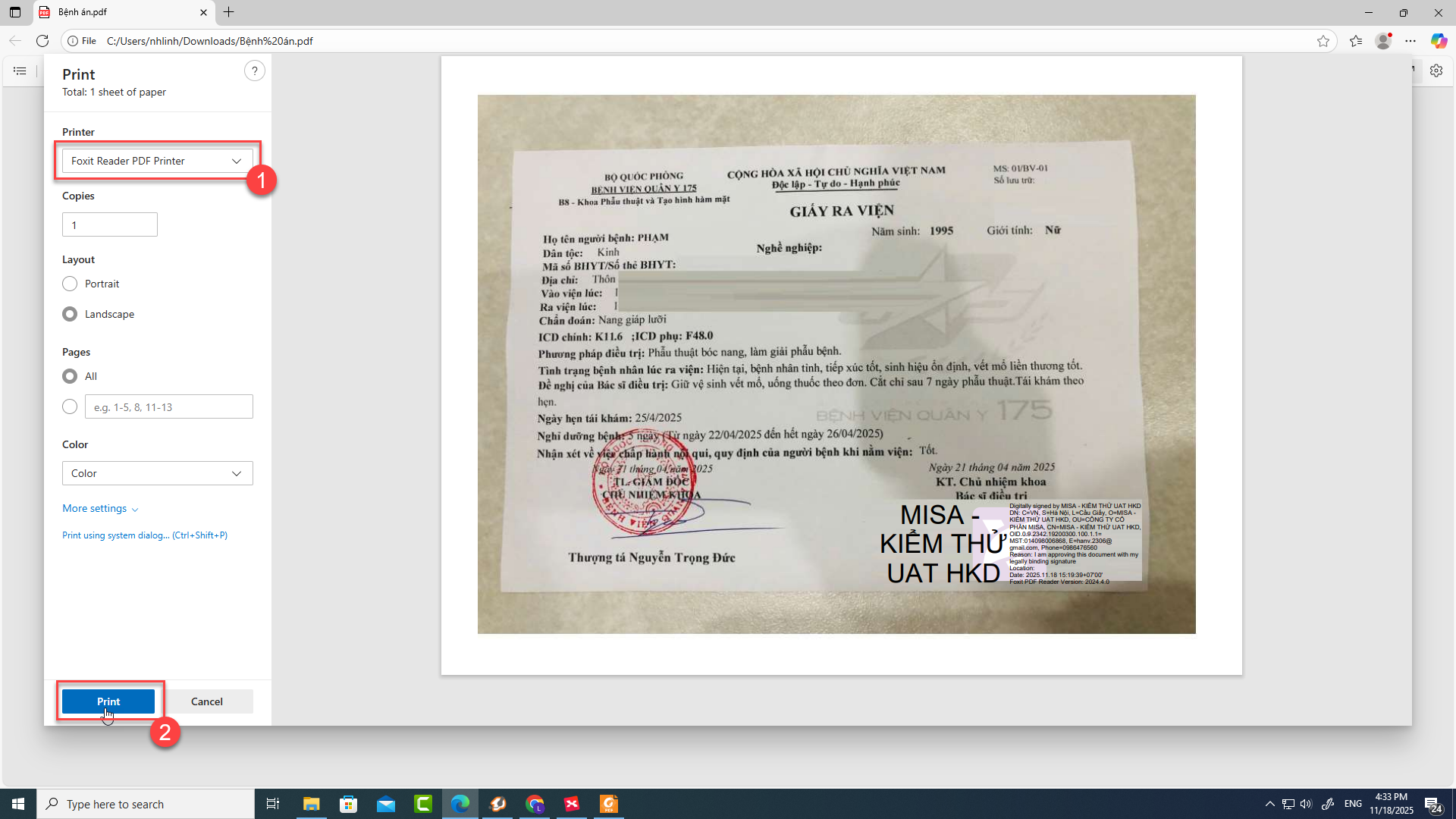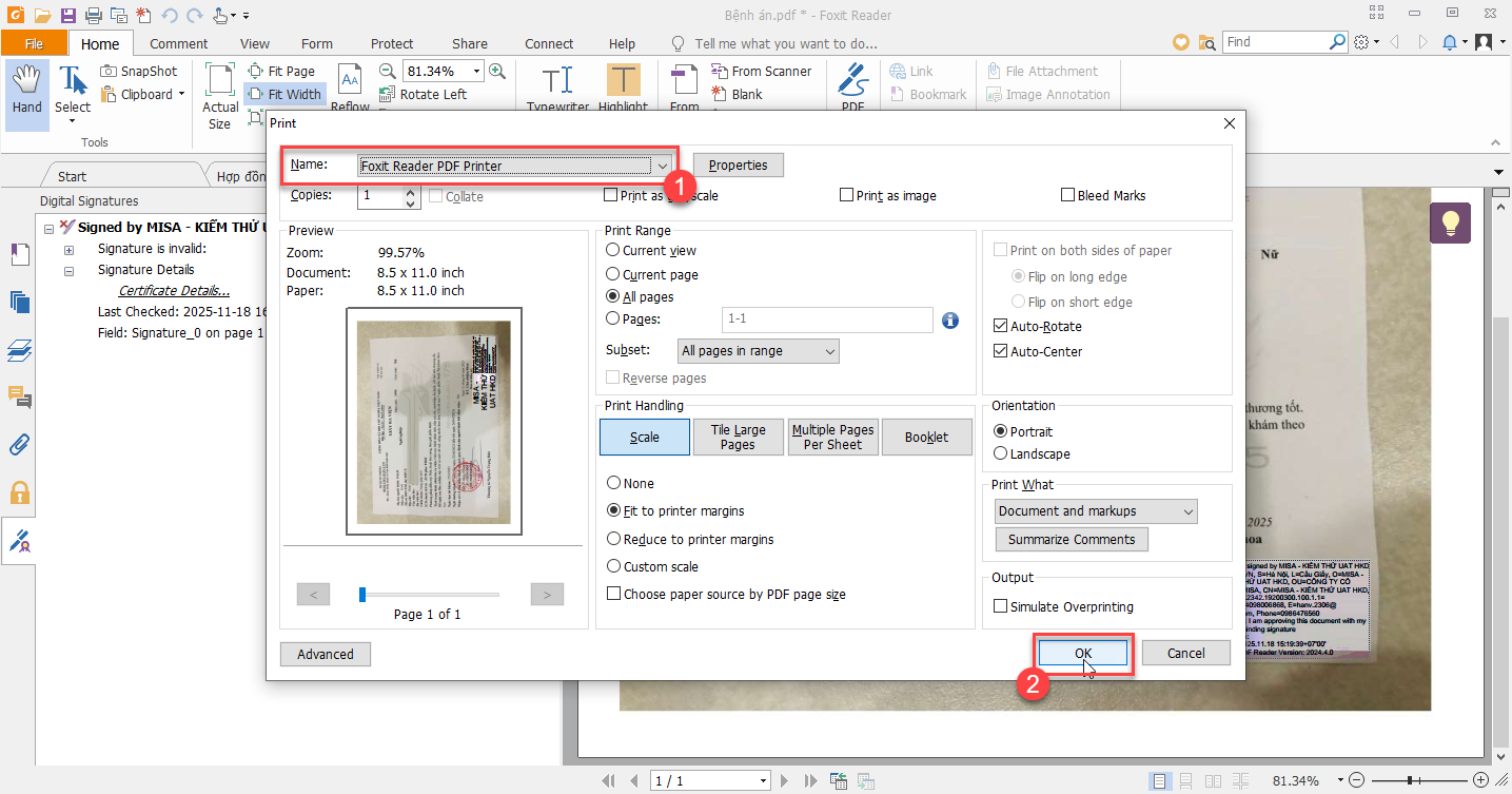 Nhấn CrtP\chọn Foxit Reader PDF Printer\nhấn OK để tạo tệp mới không chứa chữ ký.
