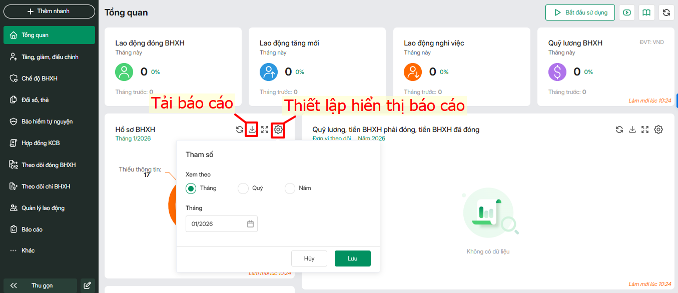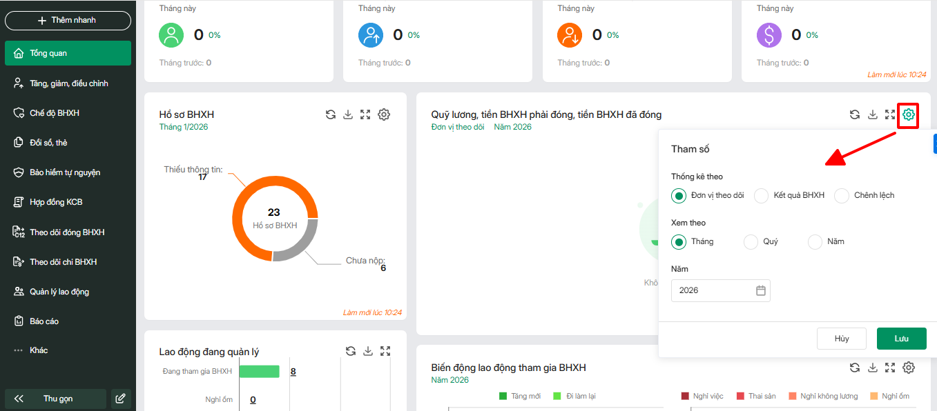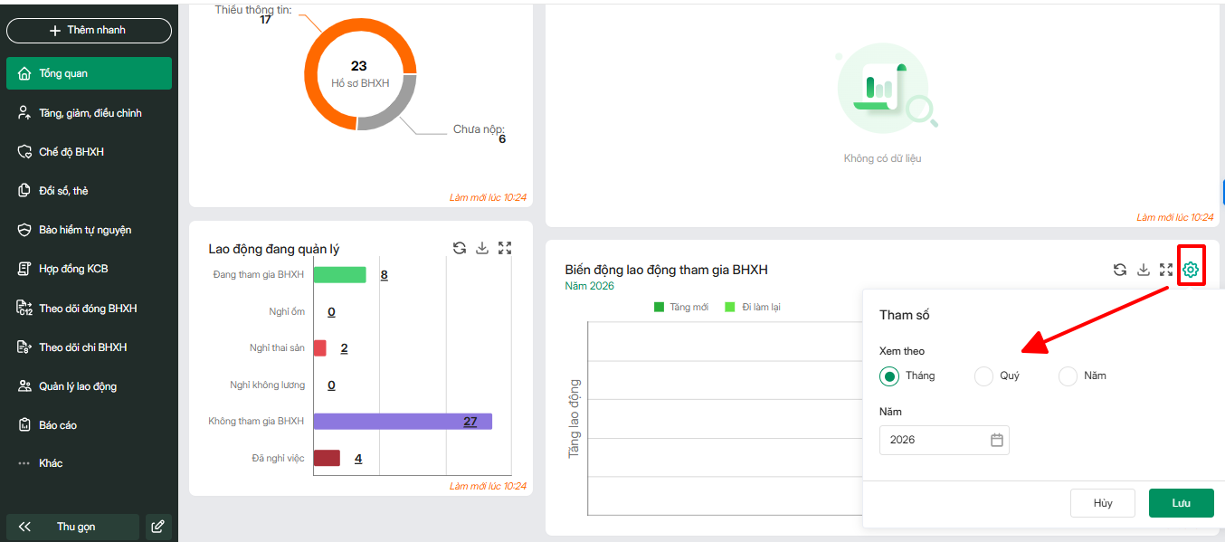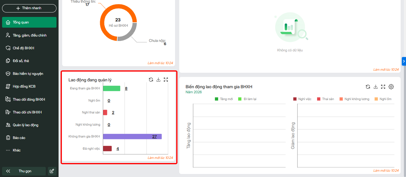 - Con số tổng quan (lao động đóng BHXH, lao động tăng mới, lao động nghỉ việc, quỹ lương BHXH): giúp HR theo dõi, nắm bắt các thông số cơ bản về lao động tham gia BHXH, quỹ lương đóng BHXH.