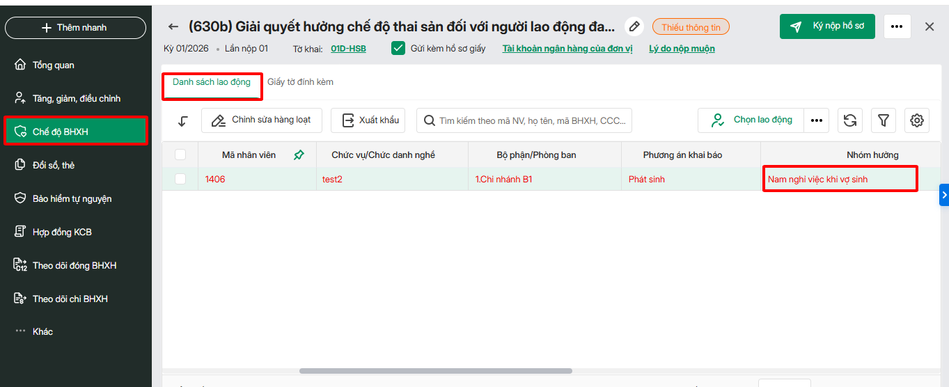 >> Chọn nhóm hưởng (T12) Nam nghỉ việc khi vợ sinh.