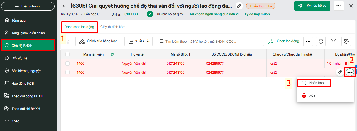 >> Chọn 2 nhóm hưởng (T12) Nam nghỉ việc khi vợ sinh và (T13) Nam hưởng trợ cấp 1 lần khi vợ sinh bằng cách Chọn thêm 2 dòng lao động hoặc Nhân bản.