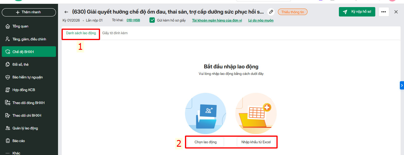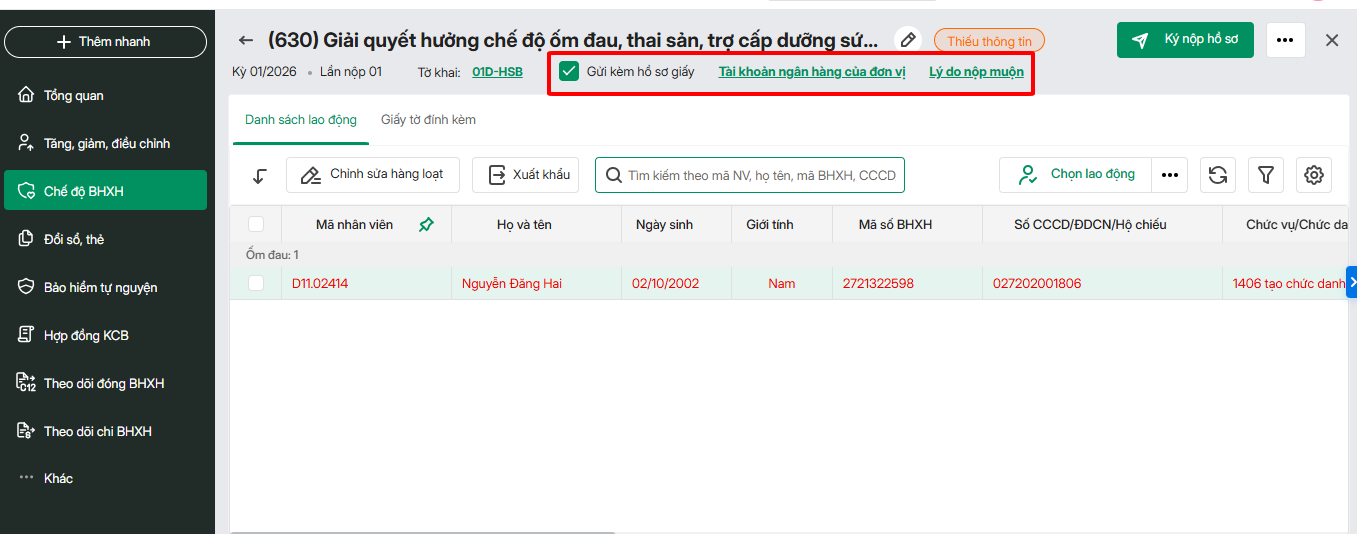 Lưu ý: Trường hợp khoảng thời gian bản thân ốm và con ốm trùng nhau, Anh/Chị thực hiện khai báo lao động 2 lần trên 1 hồ sơ 630a (dòng 1 chọn nhóm hưởng “Bản thân ốm”, dòng 2 chọn nhóm hưởng “Con ốm”).