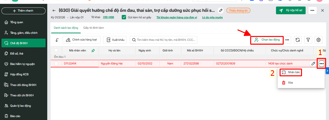 Trường hợp 1 lao động phát sinh nhiều chế độ, ví dụ như Bố và mẹ cùng nghỉ khi con ốm; Nhiều con cùng ốm có thời gian trùng nhau và không trùng nhau; Người lao động nghỉ ốm nhiều lần; Người lao động nghỉ ốm trùng thời gian con ốm. Anh/Chị cần thêm nhiều dòng lao động tương ứng với số chế độ cần giải quyết bằng cách Chọn lao động hoặc Nhân bản dòng lao động.