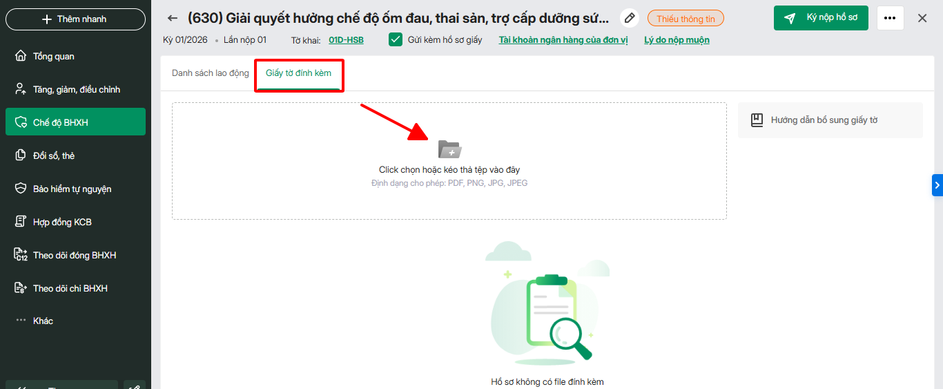 Anh/Chị bổ sung giấy tờ tại tab Giấy tờ đính kèm như sau: