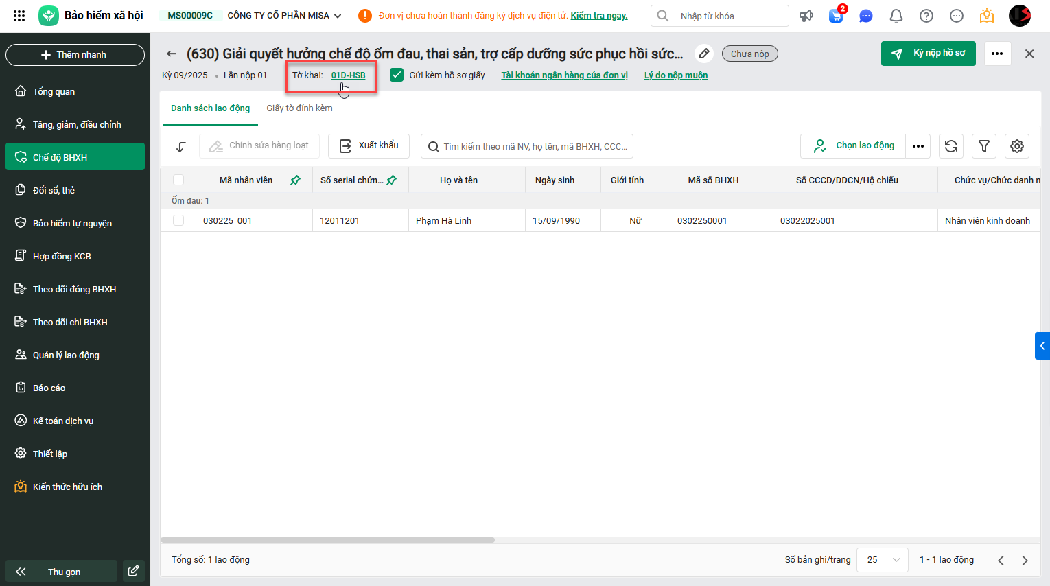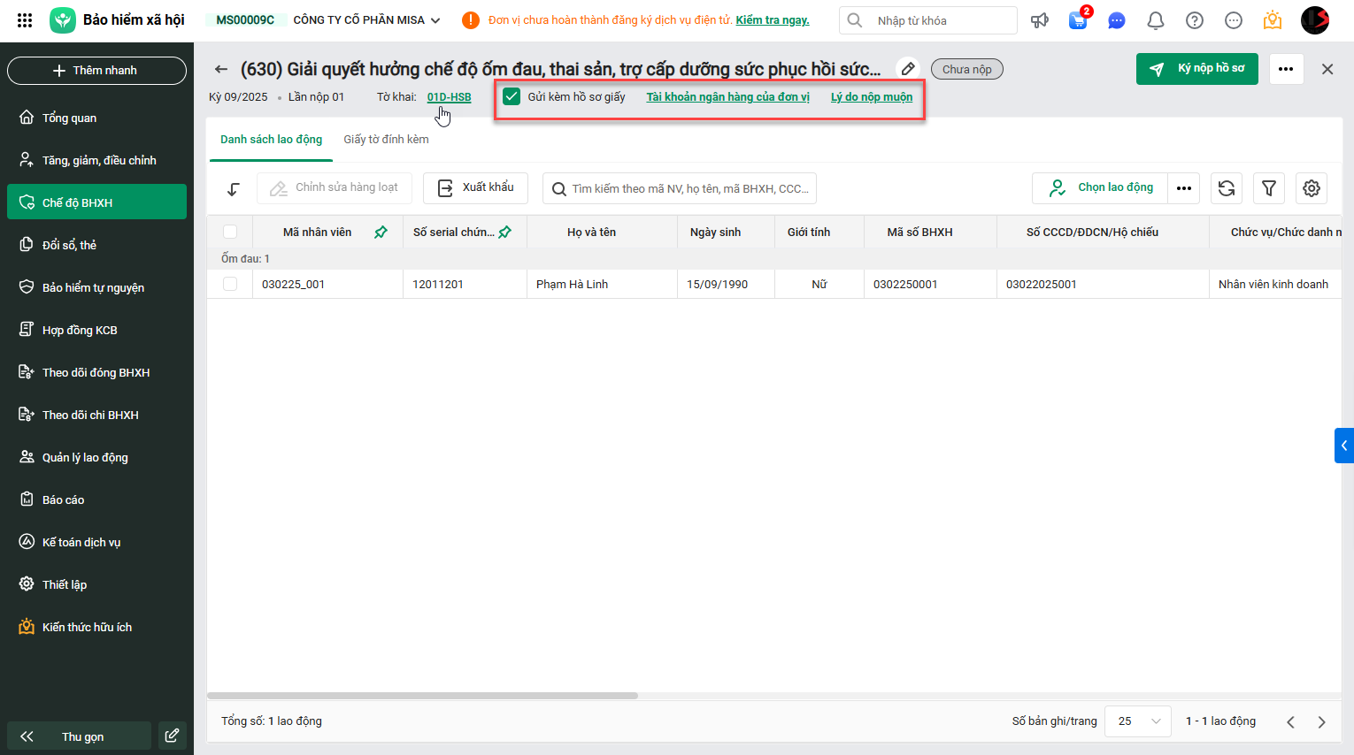 Ví dụ: Trước đó đã nộp hồ sơ giải quyết chế độ ốm đau kỳ nộp Tháng 03/2024 – Lần nộp 01, Loại phát sinh với thời gian nghỉ 5 ngày, sau đó có thêm giấy nghỉ hưởng chế độ BHXH thêm 4 ngày => Lập hồ sơ giải quyết độ ốm đau; Loại Phát sinh; Đợt duyệt bổ sung: 03/2024; Số lần nộp: 1.
