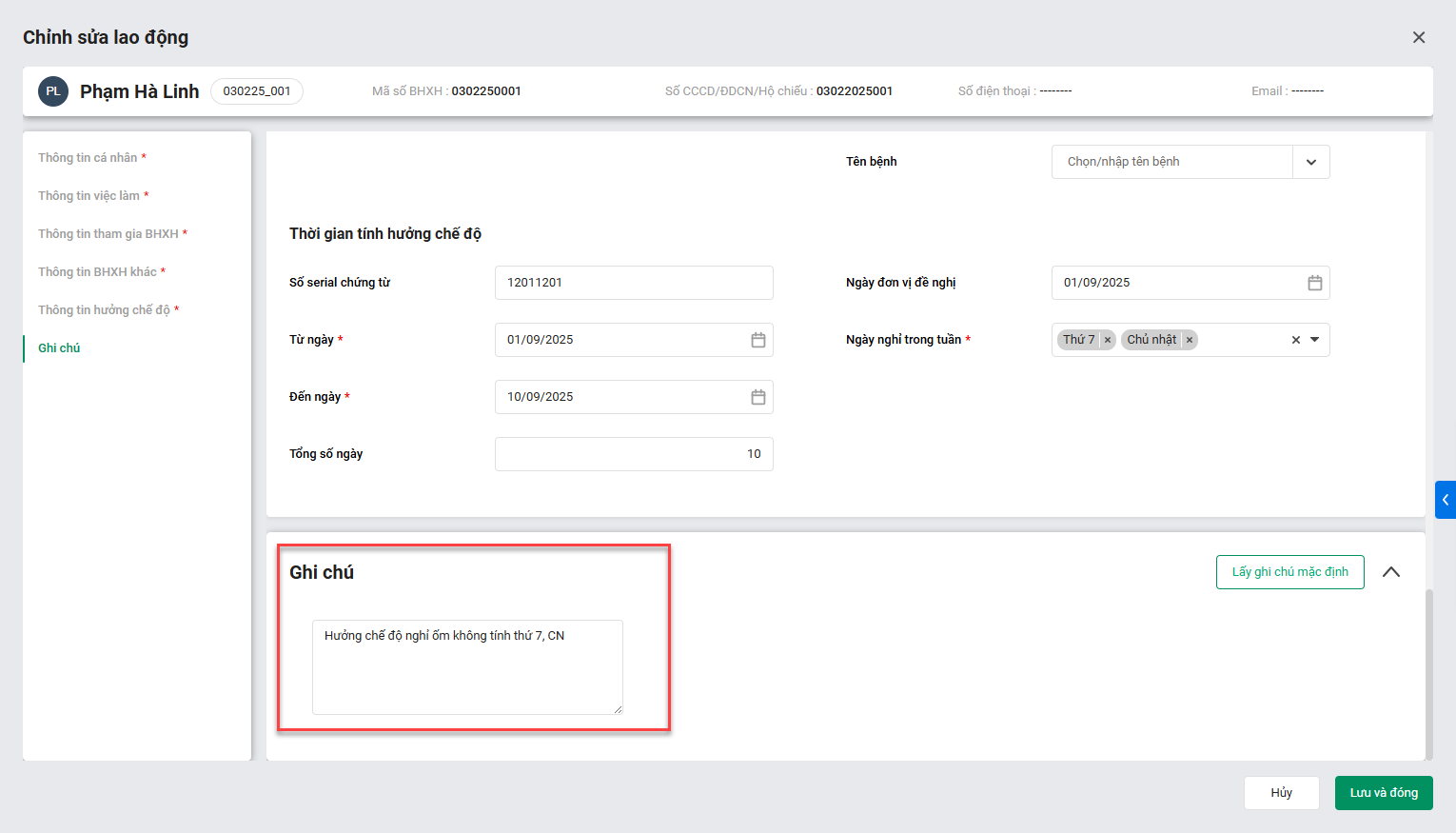 4. Tổng số ngày: Tổng số ngày nghỉ hưởng chế độ tính theo ngày làm việc, không tính nghỉ cuối tuần, lễ, tết. (Trường hợp tổng số ngày nghỉ chế độ bao gồm cả ngày nghỉ cuối tuần, lễ, tết thì cần trừ đi số ngày nghỉ cuối tuần, lễ tết).