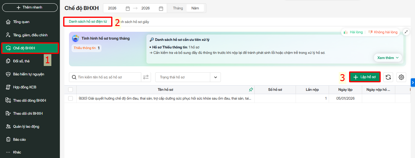 Trên phân hệ Chế độ BHXH -> Danh sách hồ sơ điện tử -> Lập hồ sơ -> Thêm hồ sơ cần lập.