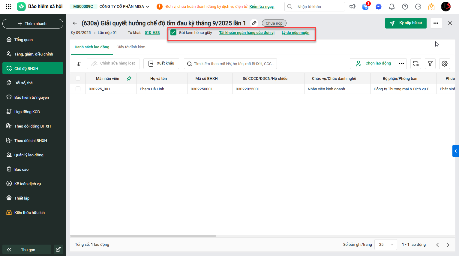 • Có nộp kèm hồ sơ giấy là giấy chứng sinh, giấy khai sinh, chứng từ bệnh viện của người lao động để giải quyết chế độ qua đường bưu điện hoặc trực tiếp tại cơ quan BHXH quận/huyện -> Tích chọn “Gửi  kèm hồ sơ giấy”.