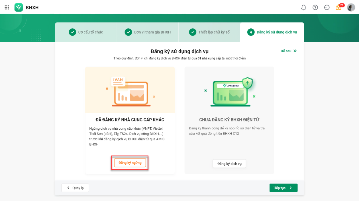 1. Nhấn Đăng ký ngừng tại mục Đã đăng ký nhà cung cấp khác.