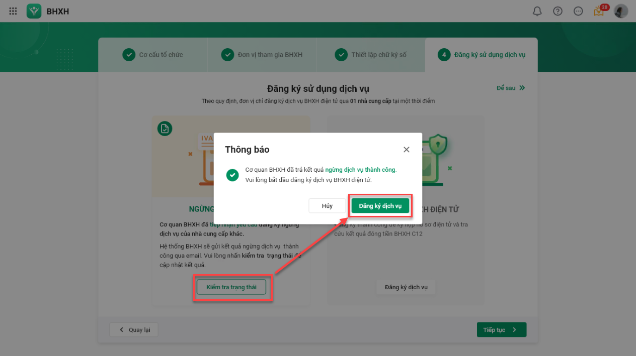 - Trường hợp Đăng ký ngừng thành công -> nhấn Kiểm tra trạng thái để cập nhật kết quả sau đó chuyển bước Đăng ký sử dụng dịch vụ BHXH của MISA.