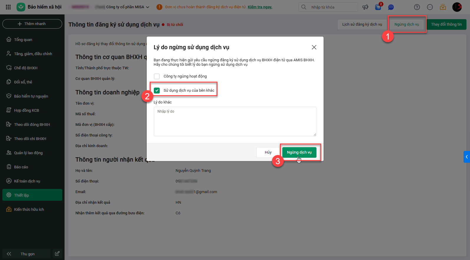 2. Khai báo thông tin tại cửa sổ ngừng dịch vụ -> nhấn Đăng ký ngừng để ký nộp hồ sơ sang cơ quan BHXH: