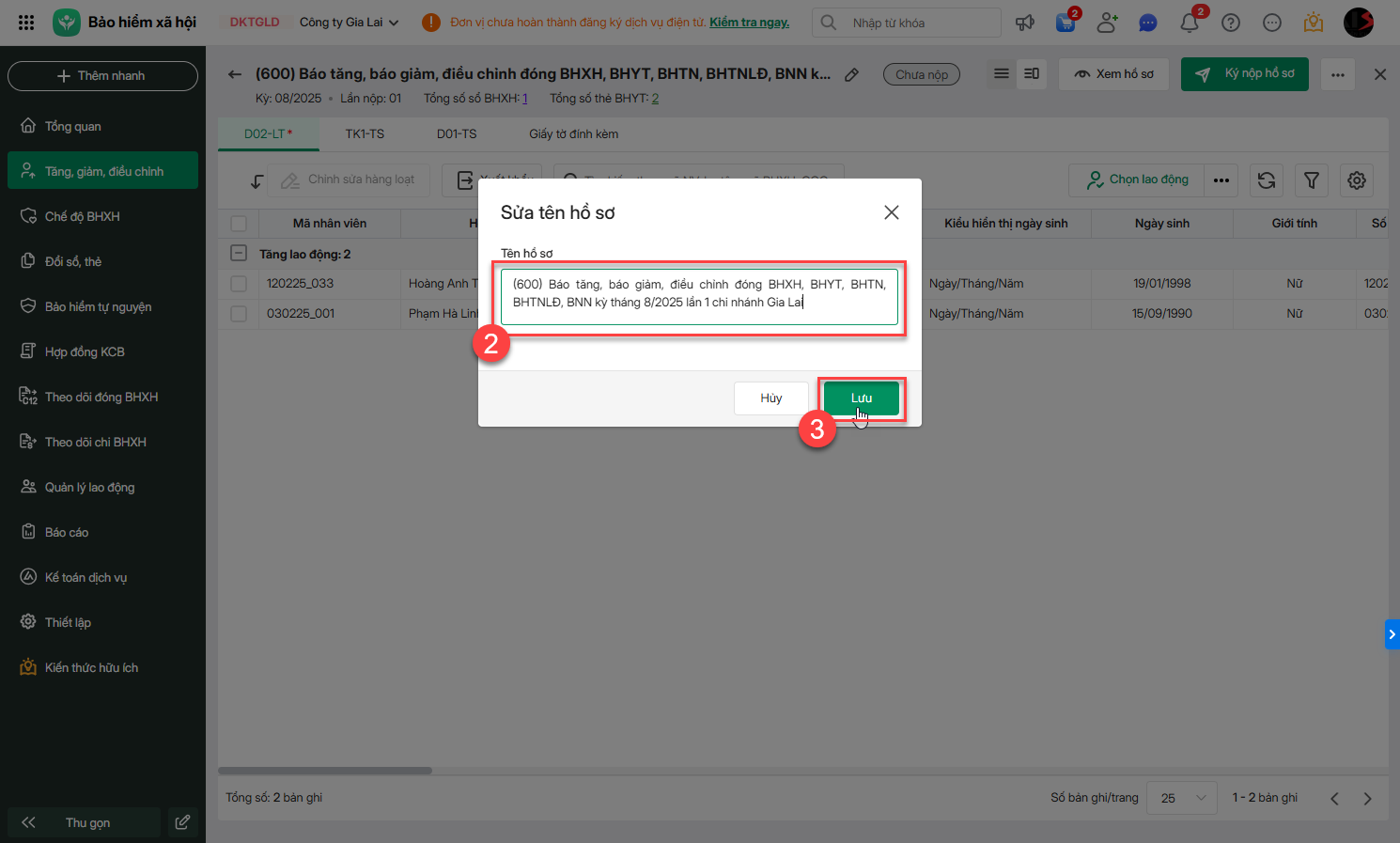 4. Nhấn Lưu để ghi nhận tên hồ sơ hiển thị trên phần mềm.