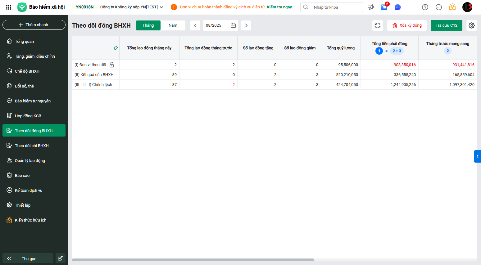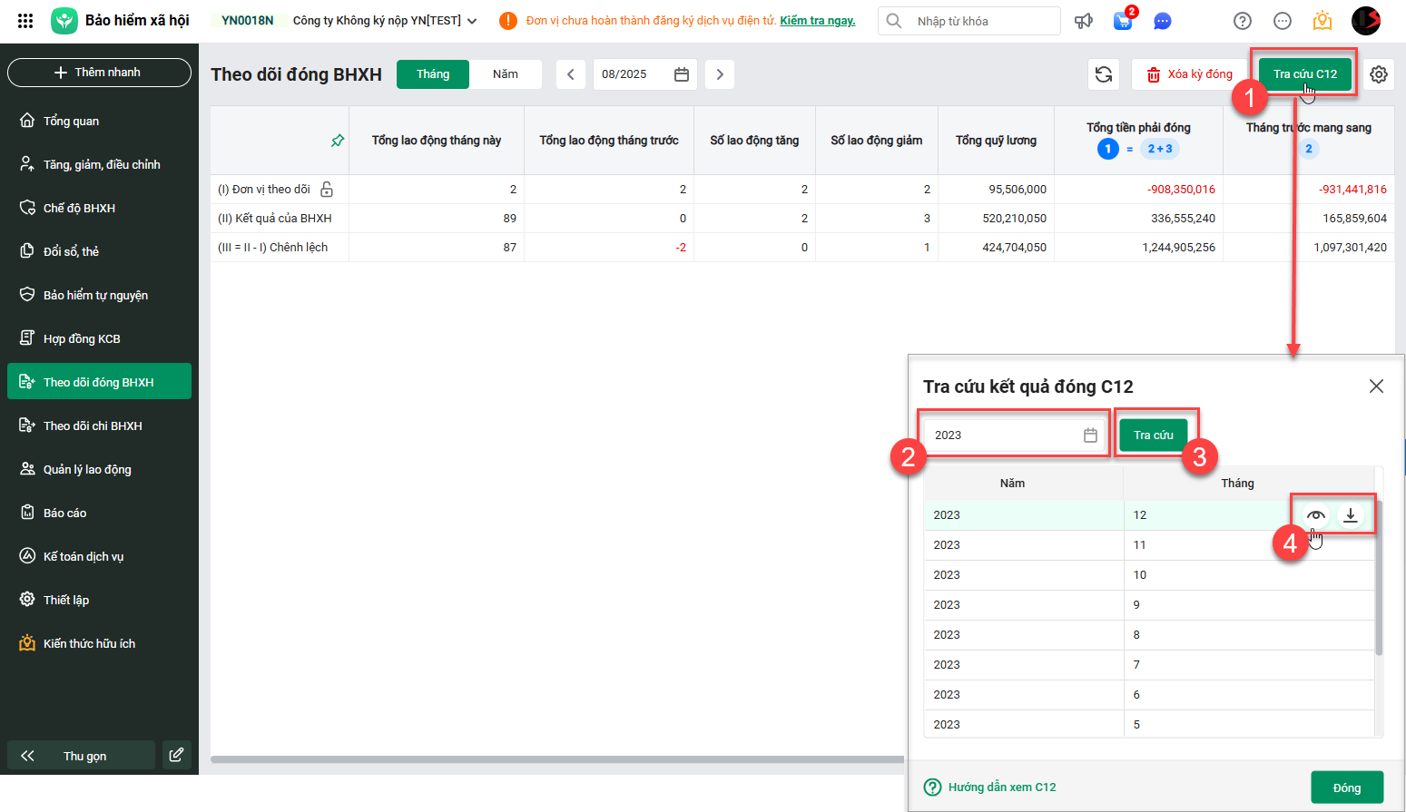 Ngoài ra, trường hợp đơn vị không cần theo dõi số tiền đóng chi tiết của từng lao động. Anh/Chị sử dụng tiện ích Tra cứu C12 ngay tại danh sách theo dõi đóng để Xem hoặc Tải về file kết quả C12 của đơn vị.