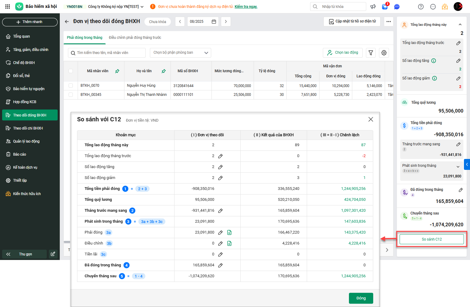 Lưu ý: Để so sánh số liệu đơn vị tự theo dõi với kết quả C12 của BHXH trả về một cách nhanh chóng và trực quan nhất, Anh/Chị sử dụng tiện ích So sánh C12.