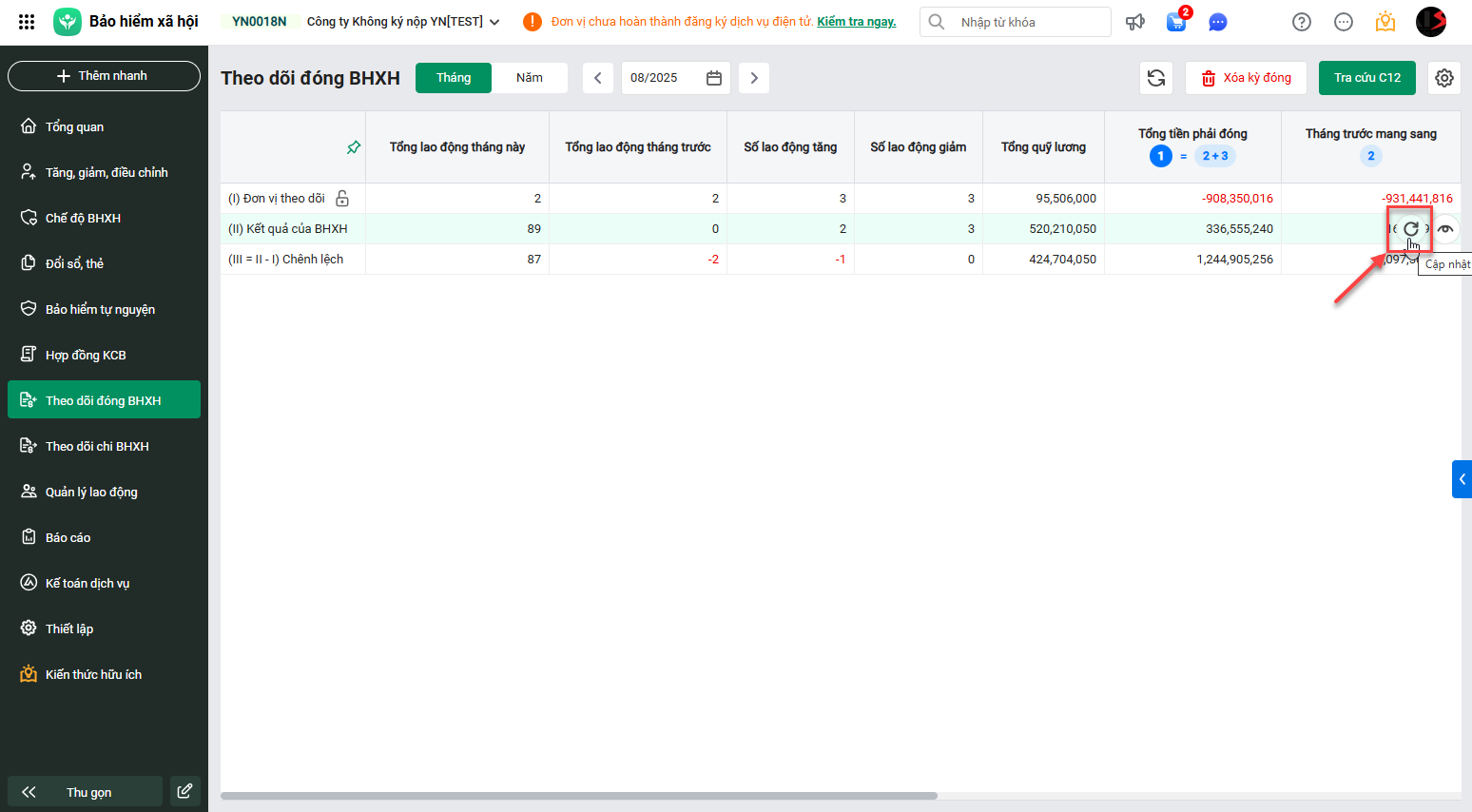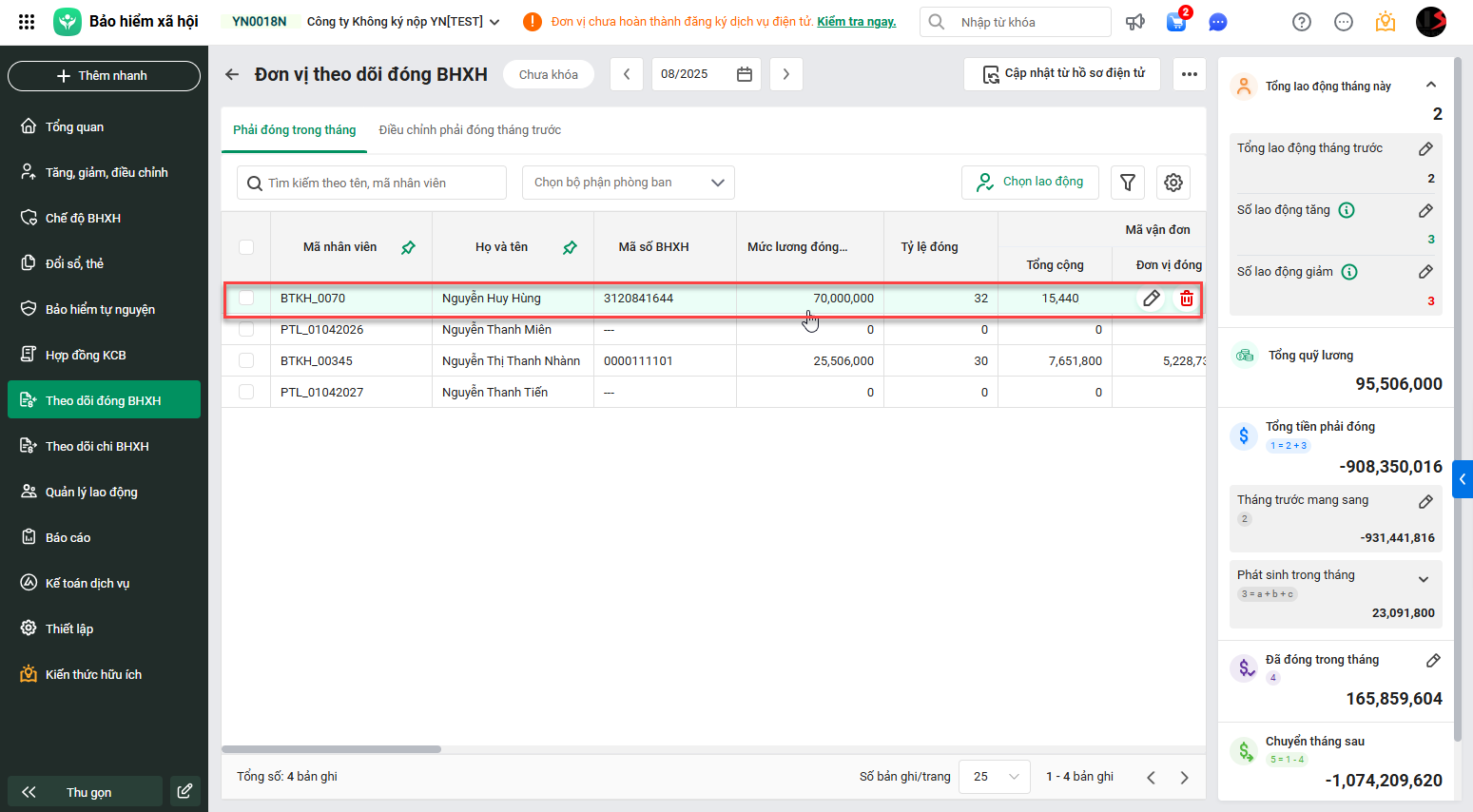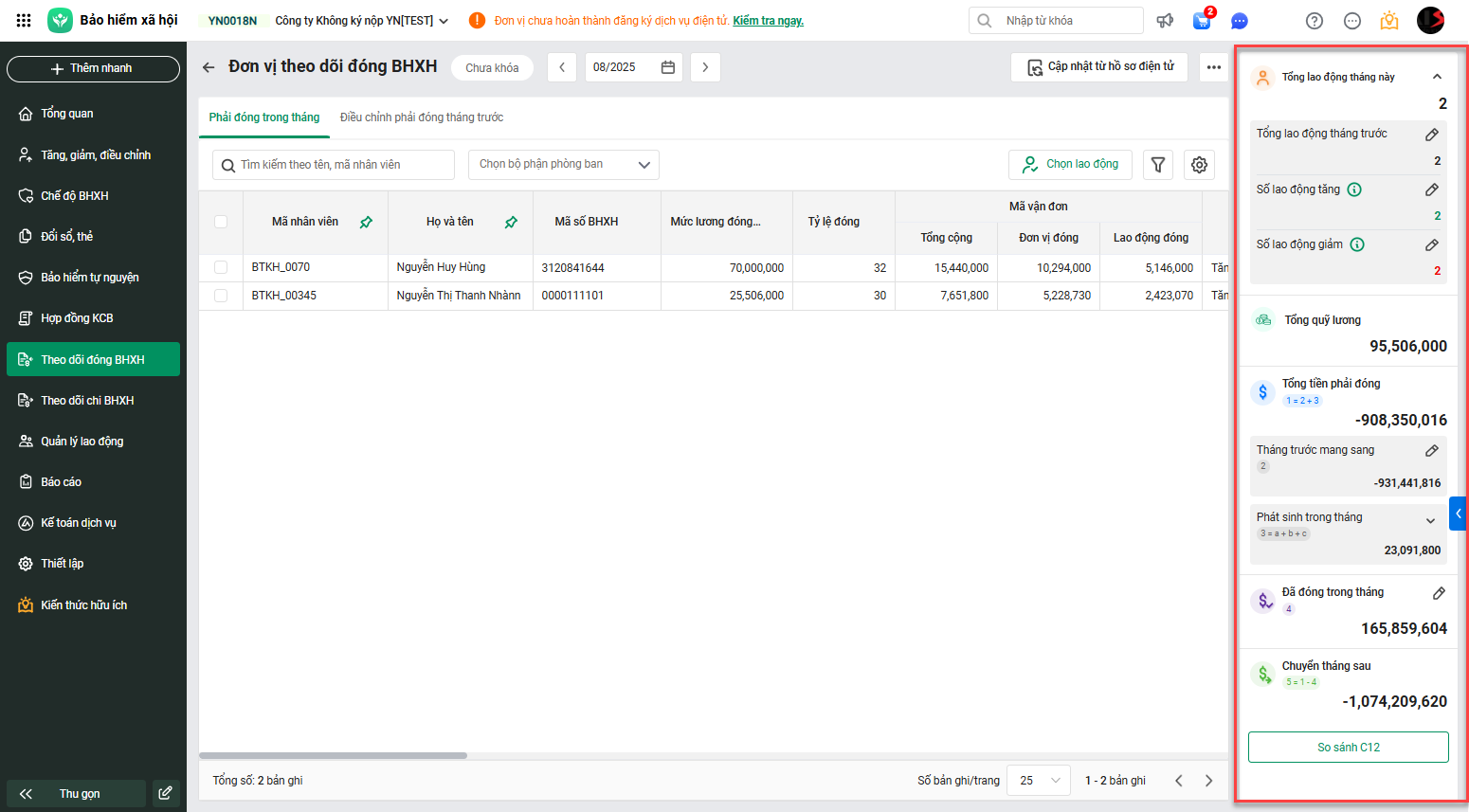 Sau khi cập nhật, kết quả đóng của lao động sẽ hiển thị tại kỳ theo dõi đóng tương ứng.