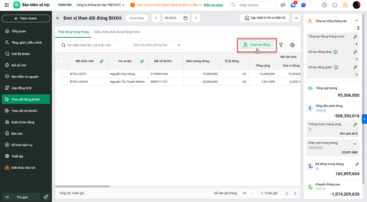 - Tại chi tiết tháng đóng nhấn Chọn lao động;