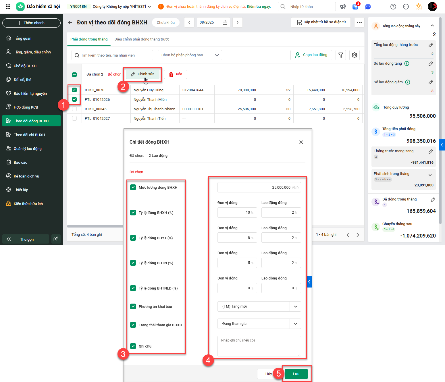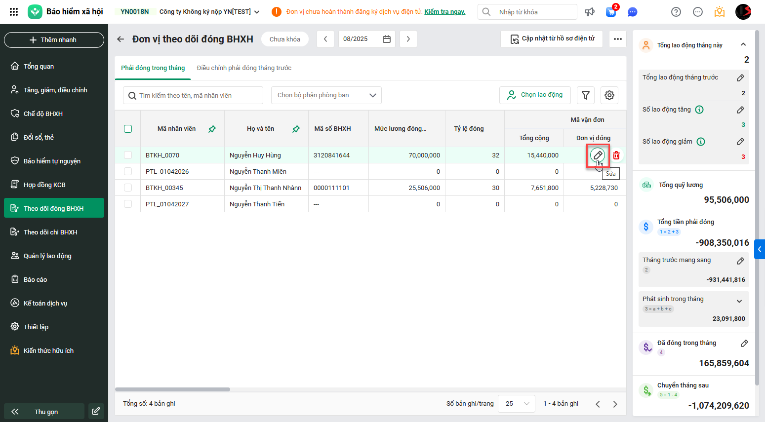 - Điều chỉnh phải đóng tháng trước: Theo dõi các lao động bị cơ quan BHXH truy thu do báo tăng, báo giảm, điều chỉnh mức đóng muộn, và lao động được hoàn trả do đóng trùng, đóng thừa.