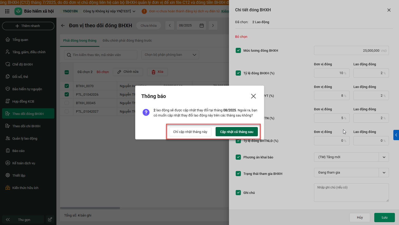 Sau khi chỉnh sửa, phần mềm sẽ gợi ý cập nhật dữ liệu vừa chỉnh sửa cho cả các tháng sau, Anh/Chị có thể lựa chọn Chỉ cập nhật tháng này hoặc Cập nhật cả tháng sau để không phải sửa dữ liệu ở các tháng tiếp theo.