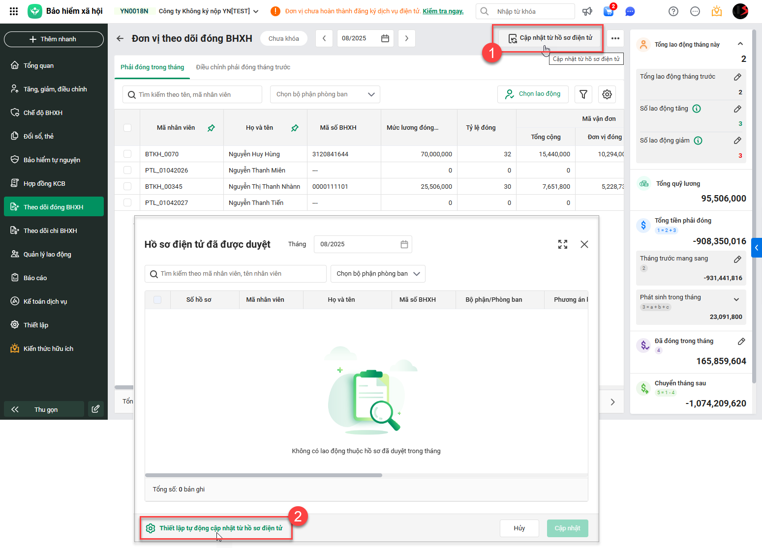 Để cập nhật kết quả đóng từ hồ sơ điện tử đã được duyệt trong kỳ và ngoài kỳ đóng (HR nộp trước/nộp bù sau kỳ đóng) vào kỳ theo dõi đóng, Anh/Chị chọn Cập nhật từ hồ sơ điện tử.