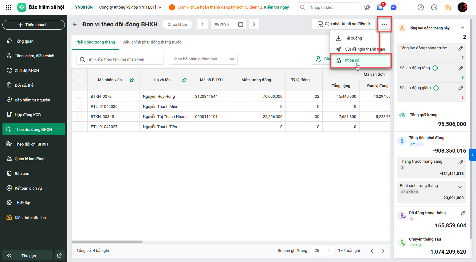 Sau khi chốt số tiền đóng BHXH hàng tháng, Anh/Chị có thể sử dụng chức năng khóa kỳ đóng để thông tin không bị cập nhật lại do chỉnh sửa hàng loạt từ kỳ đóng khác hoặc cập nhật lại từ hồ sơ điện tử đã duyệt.