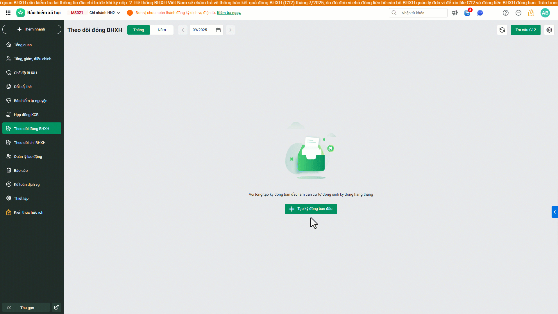 Sau khi tạo kỳ đóng ban đầu, chương trình sẽ tự động tạo kỳ đóng hàng tháng đến tháng/năm hiện tại.