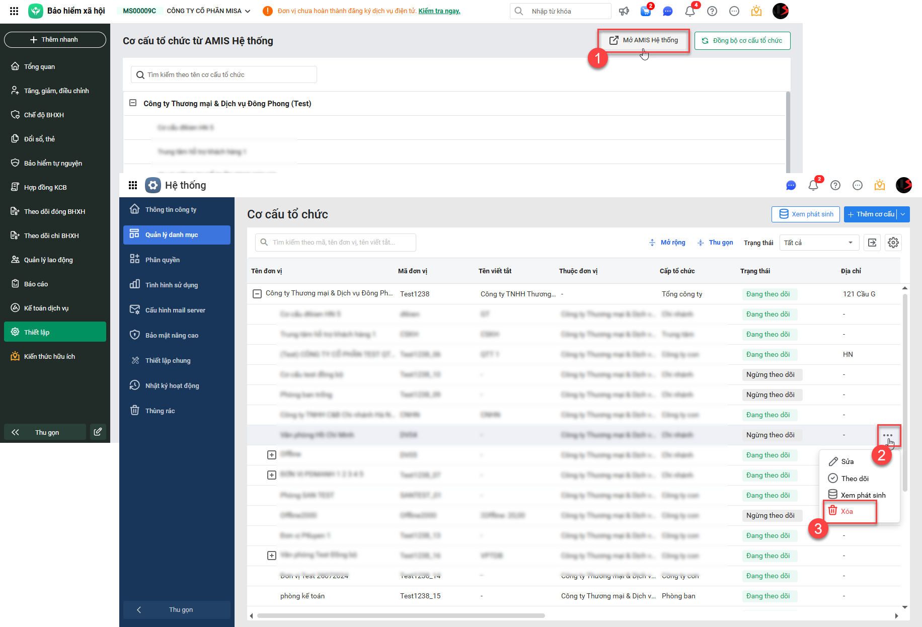 2. Anh/Chị có thể xóa bộ phận/phòng ban không sử dụng nữa bằng cách Mở AMIS Hệ thống\chọn Xóa. Sau khi xóa, Anh/Chị nhấn Đồng bộ cơ cấu tổ chức để đồng bộ lại cơ cấu tổ chức mới nhất.