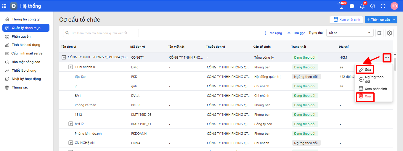 - Trên Amis hệ thống, Anh Chị nhấp vào dấu 3 chấm “…” cuối dòng phòng ban/tổ chức cần chỉnh sửa, Anh Chị thao tác chọn Xóa/sửa.