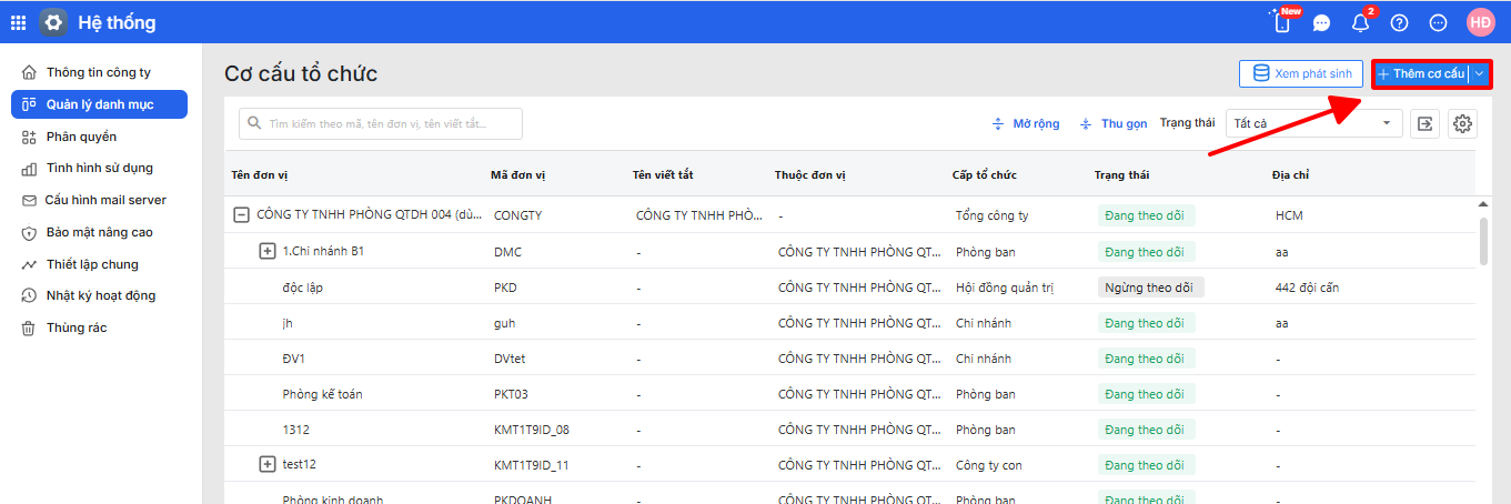 Bước 2: Thêm mới, chỉnh sửa phòng ban/cơ cấu tổ chức