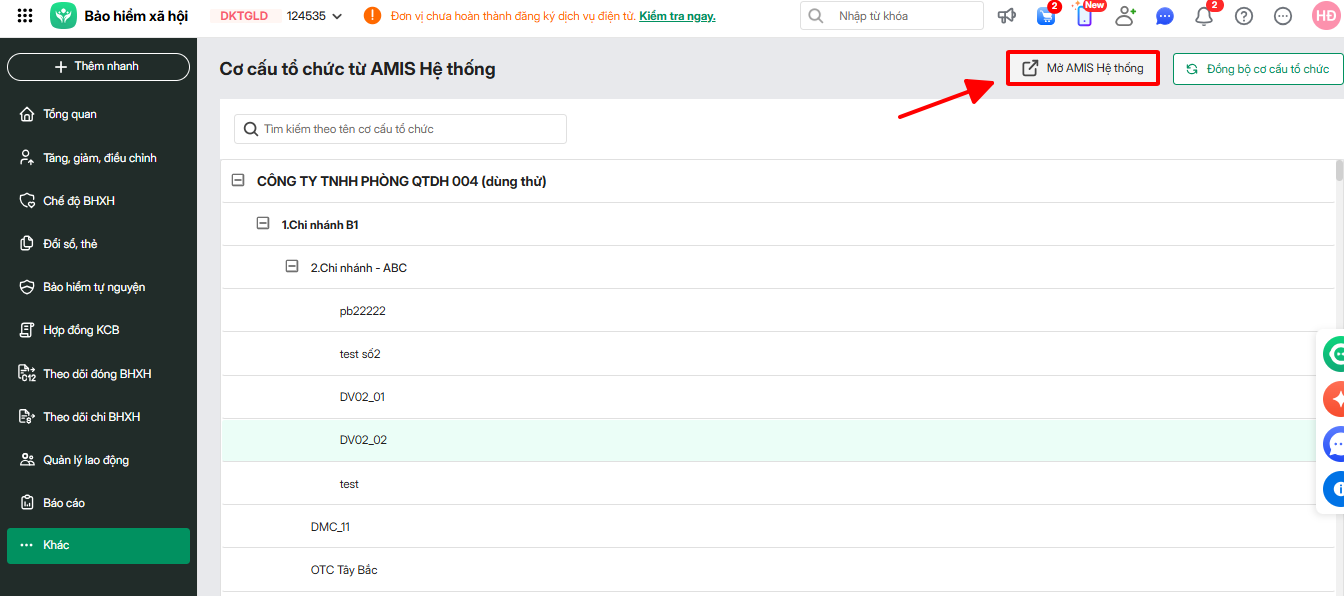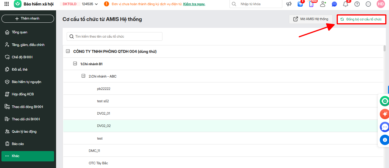 - Sau khi xóa, Anh/Chị quay lại giao diện Amis BHXH nhấn Đồng bộ cơ cấu tổ chức để đồng bộ lại cơ cấu tổ chức mới nhất.