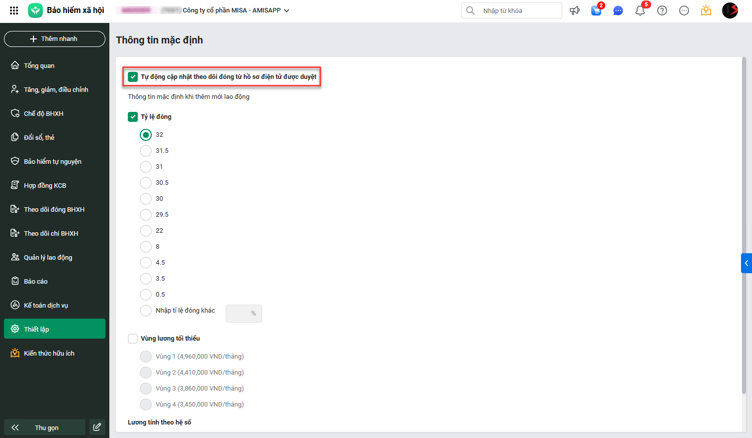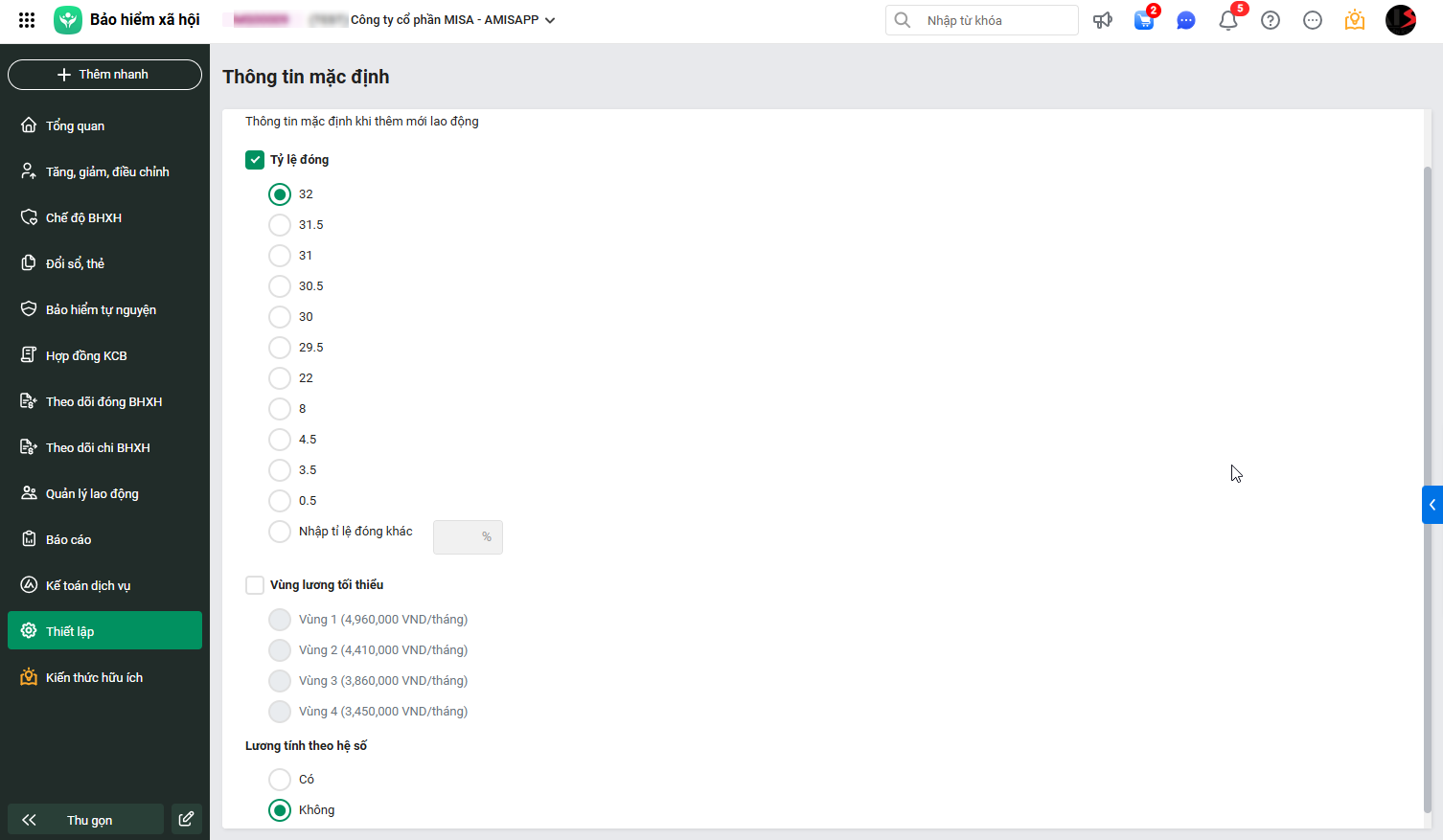 Tại Thiết lập\Thông tin mặc định: tích chọn trường thông tin sau đó chọn phương án khai báo muốn đặt mặc định. Các trường thông tin cho phép mặc định bao gồm: tỉ lệ đóng, vùng lương tối thiểu, lương tính theo hệ số. Sau khi tích chọn, phần mềm sẽ tự động lưu lại các thiết lập đó.