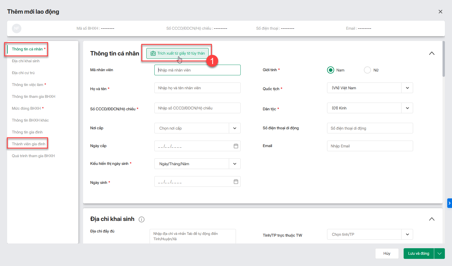 Tại chi tiết lao động, mục Thông tin cá nhân hoặc Thành viên gia đình, nhấn Trích xuất từ giấy tờ tùy thân.