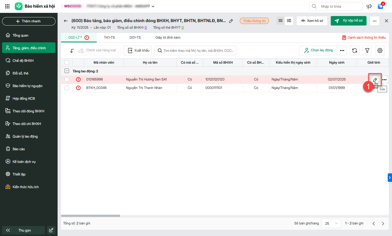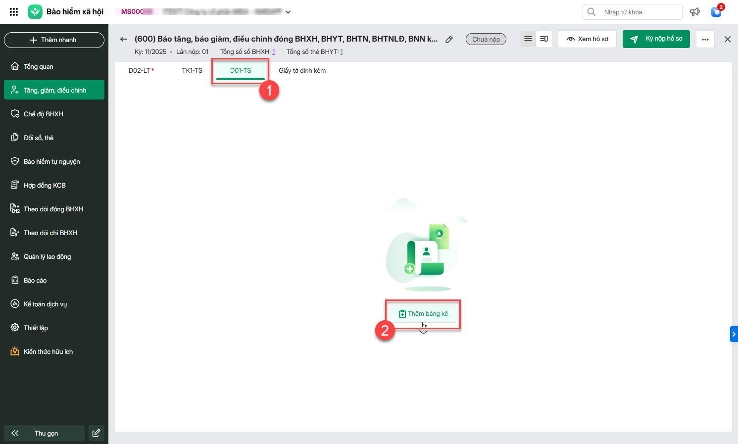 Lưu ý: Nhiều đơn vị khi thao tác ký nộp hồ sơ Tăng/Giảm/Điều chỉnh gặp cảnh báo : Đơn vị chưa khai báo đầy đủ thông tin bảng kê để lên mẫu D01-TS, hồ sơ có thể bị từ chối.