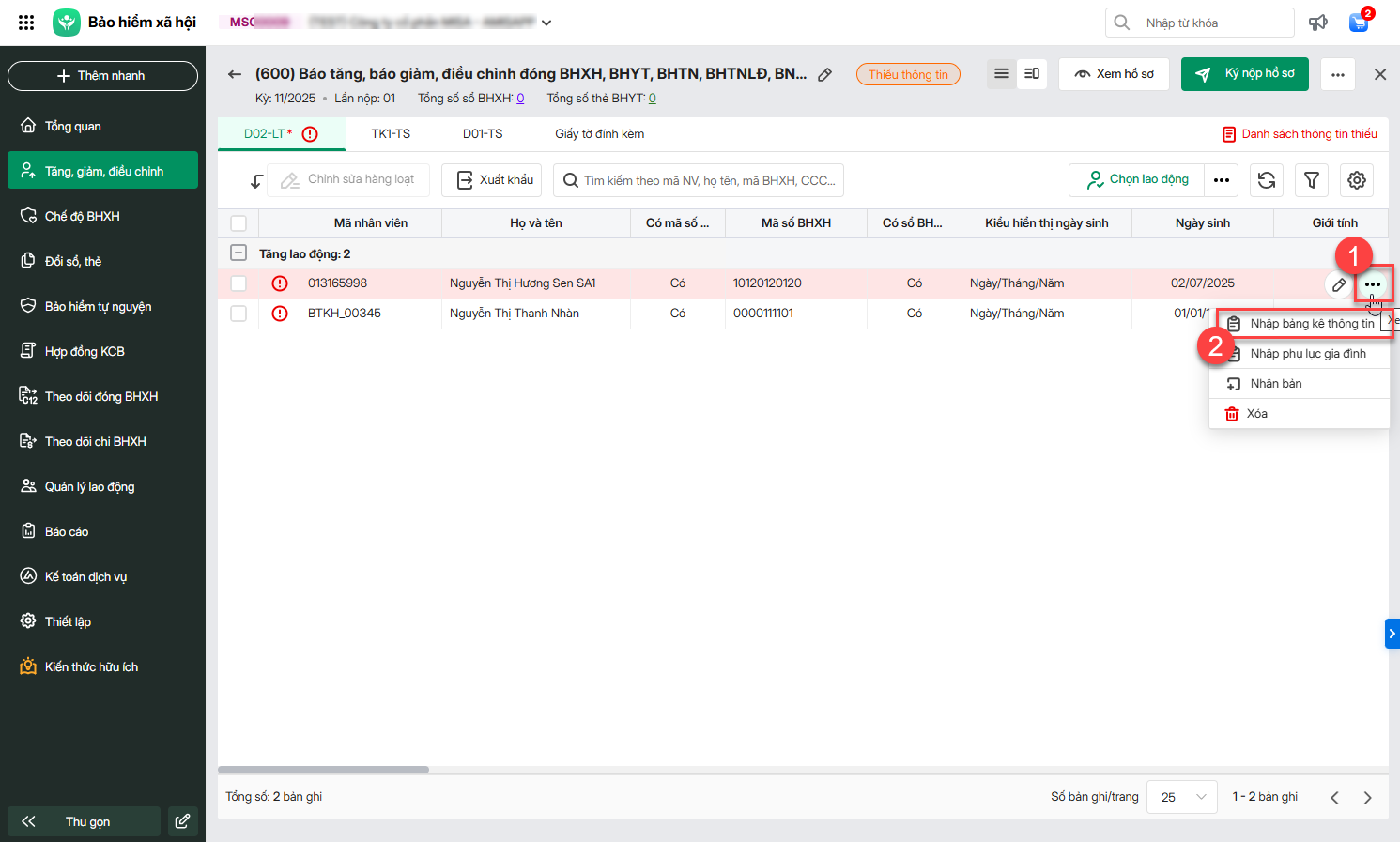 Cách 1: Nhập nhanh bảng kê thông tin tại danh sách lao động trên hồ sơ