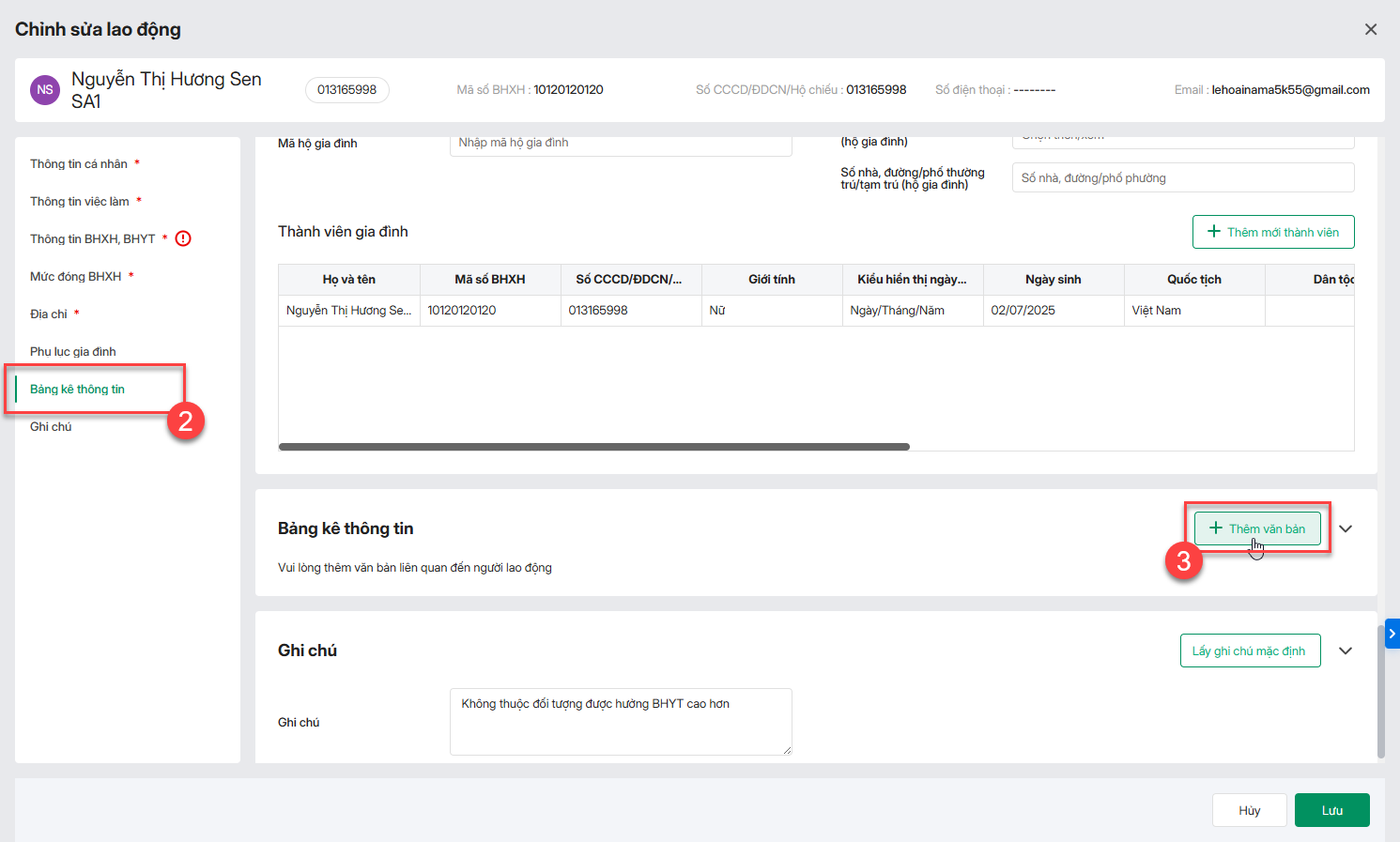 Cách 2: Nhập bảng kê thông tin tại chi tiết lao động