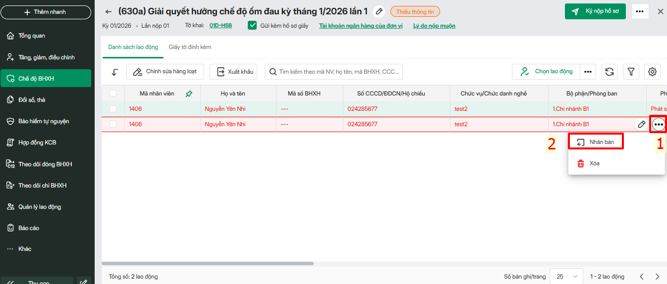 Lập hồ sơ 630a sau đó chọn lao động 2 lần để khai báo 2 giấy ra viện hoặc thao tác nhân bản từ lao động trên hồ sơ. Xem hướng dẫn lập hồ sơ 630a tại đây.