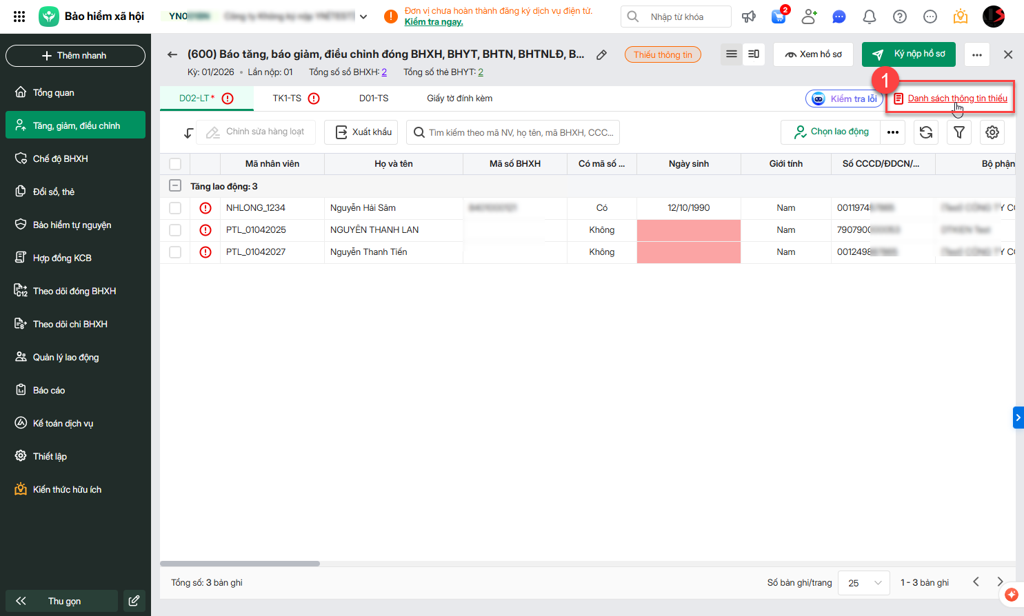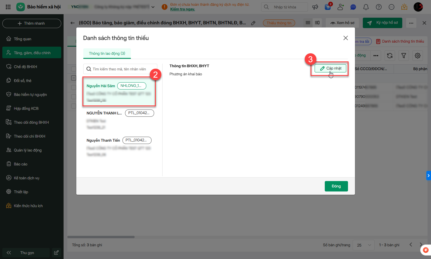 Tại Danh sách thông tin thiếu: chọn lao động\nhấn Cập nhật để bổ sung các thông tin còn thiếu.