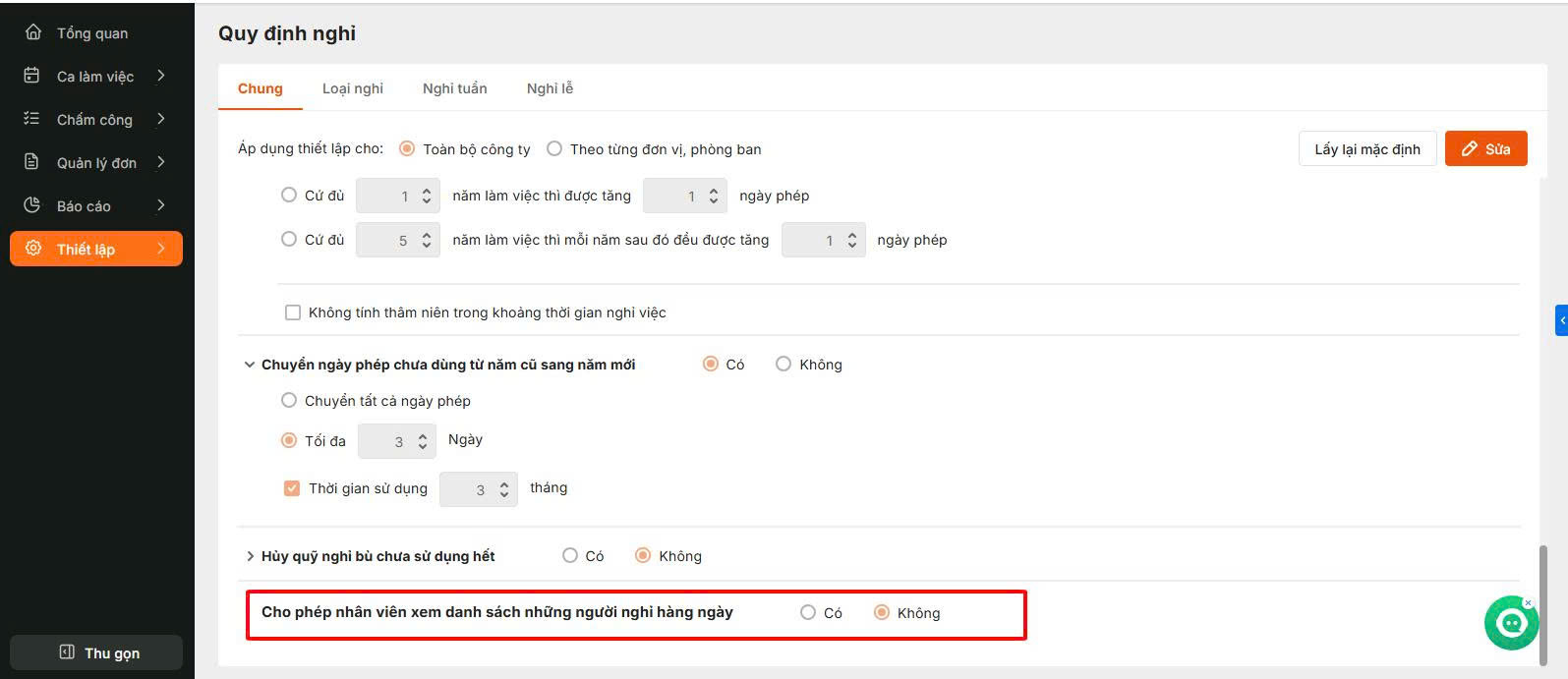 - Bật tiện ích cho phép nhân viên xem danh sách nghỉ
