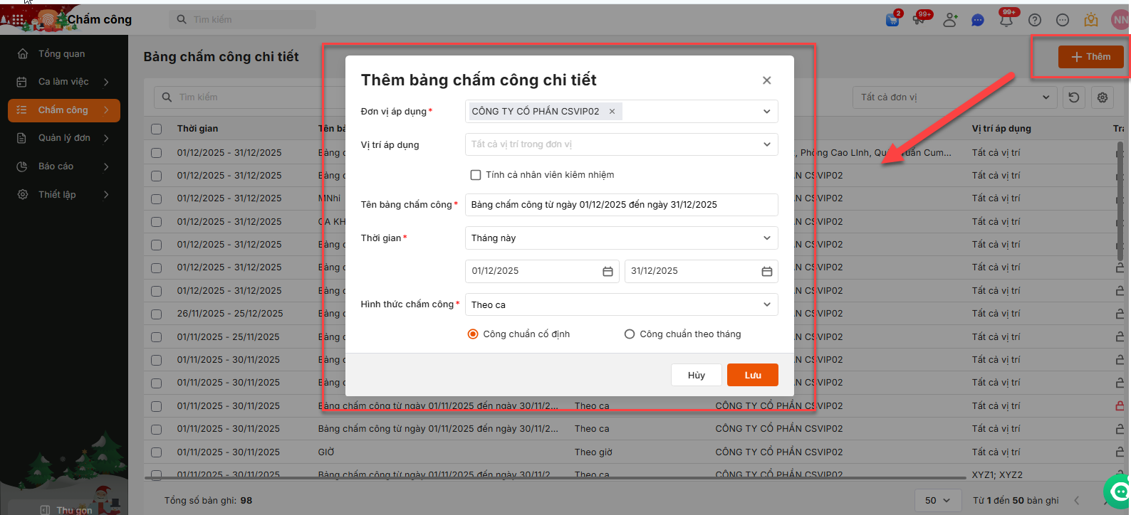 >>> Xem thêm: Top phần mềm chấm công miễn phí tốt nhất hiện nay 2.2 Khai báo bảng chấm công chi tiếtHàng tháng, Anh/Chị thực hiện tại phân hệ Chấm công \ Bảng chấm công chi tiết \ Nhấn Thêm để tạo bảng chấm công chi tiết mới .