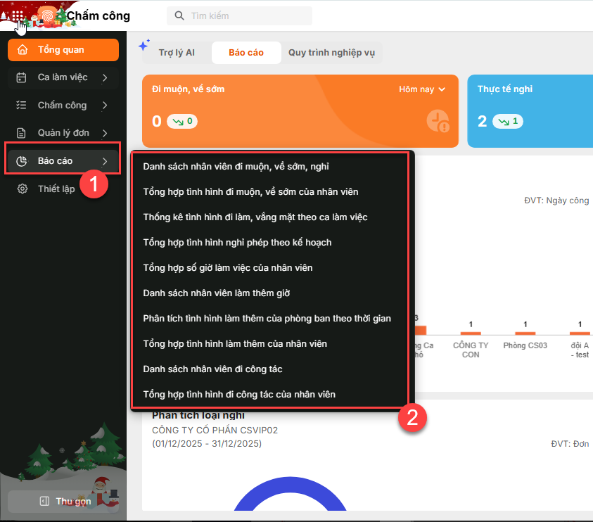 Mục đích: Hướng dẫn xem các báo cáo về tình hình đi làm, nghỉ, đi muộn/về sớm, làm thêm giờ và đi công tác của nhân viên.